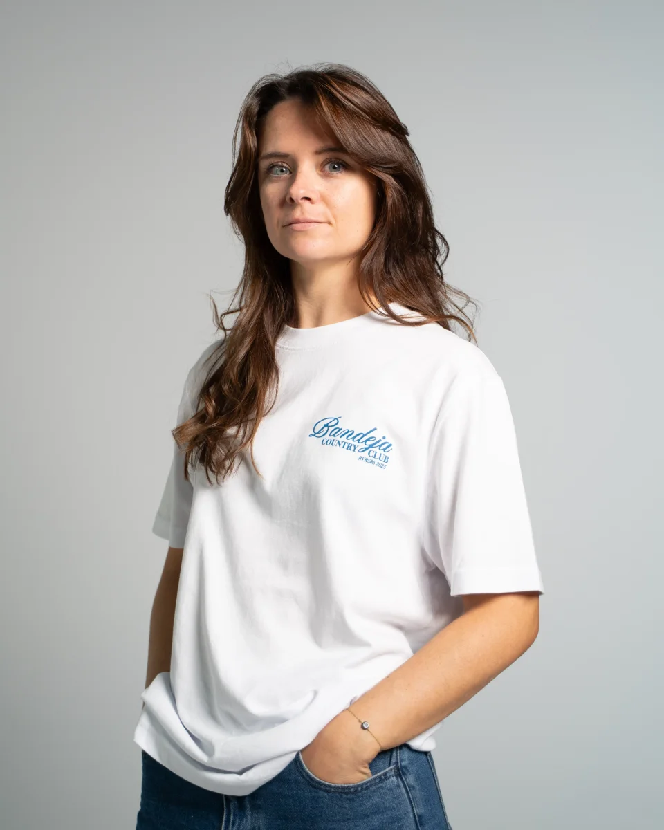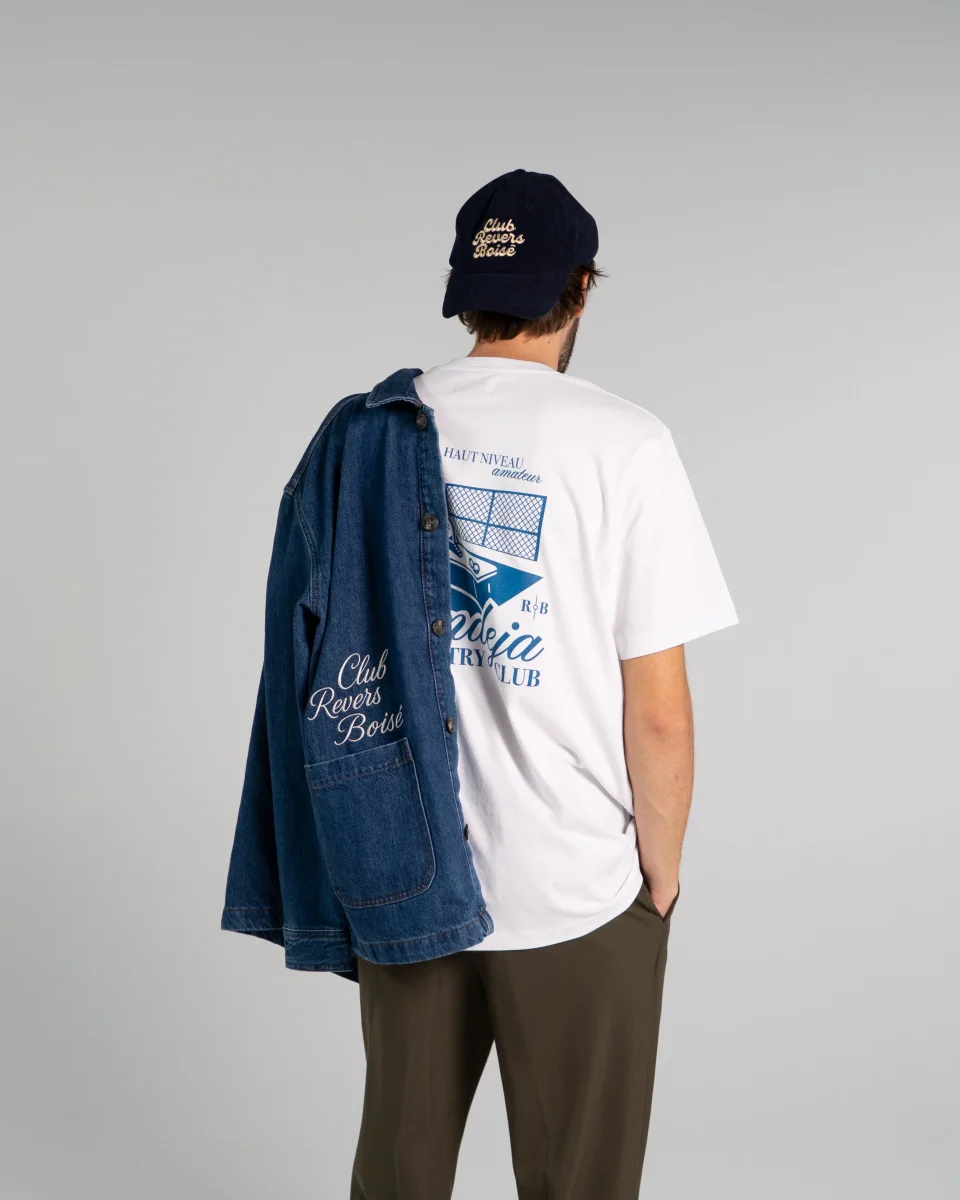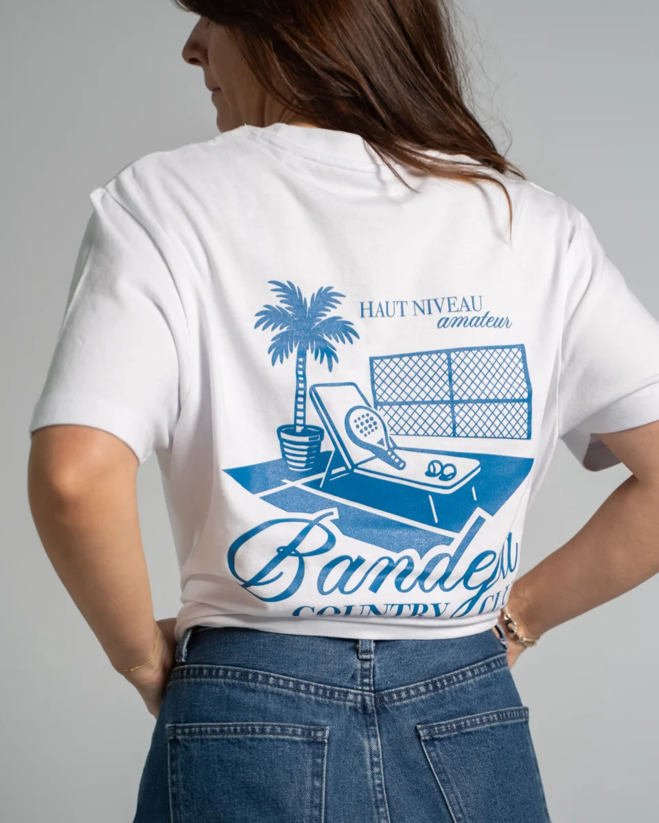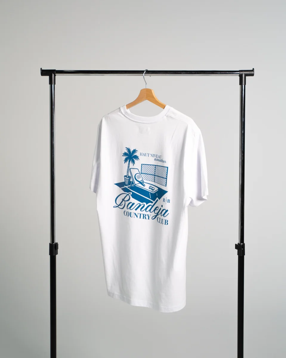 Au dos, une grande sérigraphie bleue revisite les codes du tee-shirt Bandeja original, symbole d’appartenance au club et clin d’œil à l’univers du padel. Sur le cœur, une discrète sérigraphie vient parfaire l’équilibre du design.