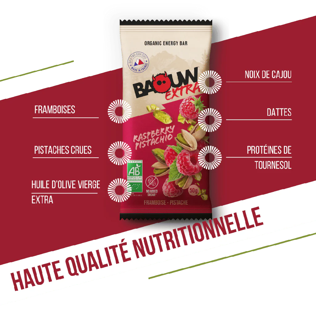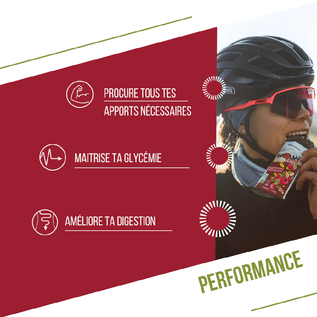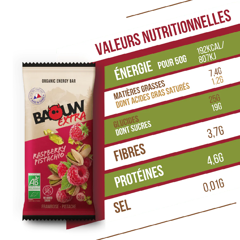 ✔ Énergie durable grâce aux glucides naturels de la framboise et aux bons lipides de la pistache