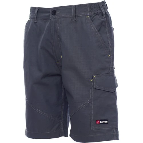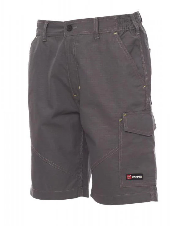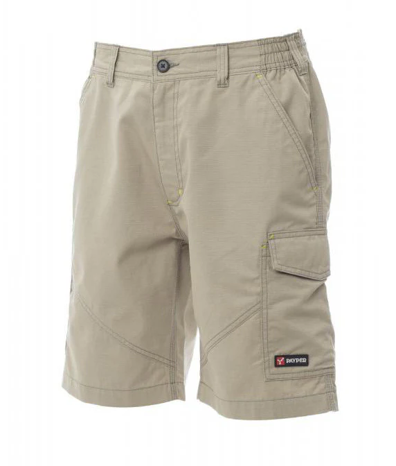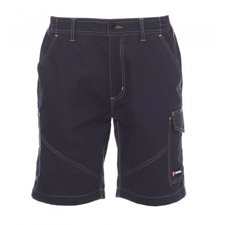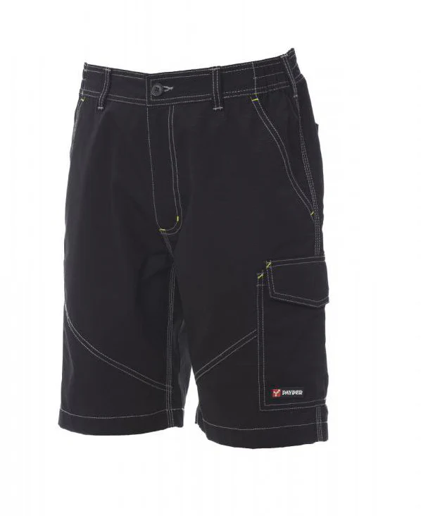Bermuda homme, élastiques latéraux et passants à la taille, fermeture éclair et bouton en plastique, deux poches de coupe classique sur le devant, une poche latérale LOCK SYSTEM, un porte-mètre, deux poches arrière, une ouverte et une avec rabat et velcro, inserts et surpiqûres en contraste, bandes réfléchissantes sur poche arrière, triples coutures.