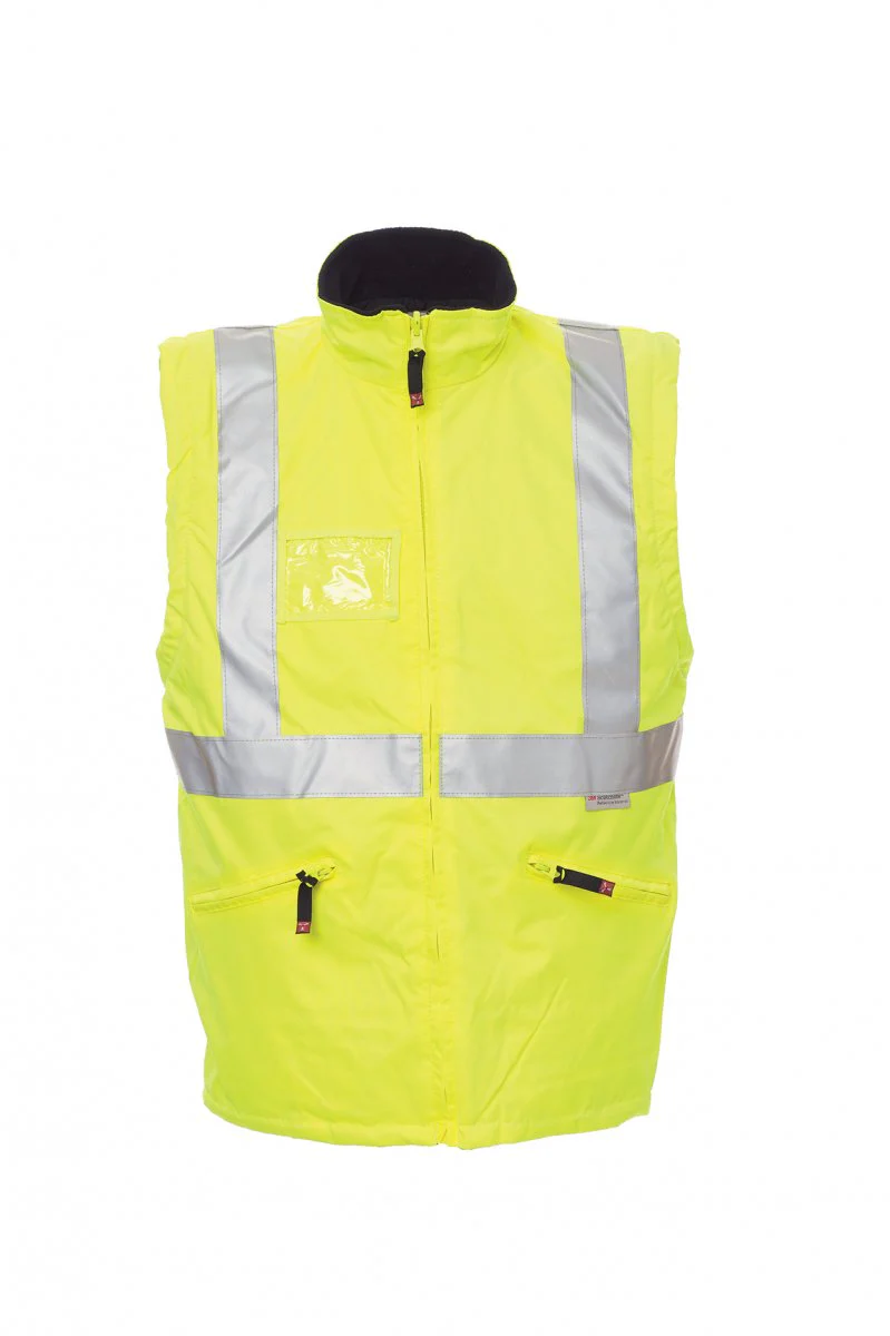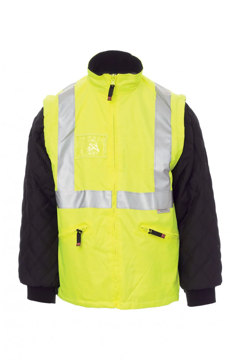 Parka pour homme quatre usages à haute visibilité avec bandes 3M, composée de : veste extérieure non matelassée, zip en plastique avec curseur en métal couvert par patte et boutons, capuche profilée et coulisse pliable dans le col, poignets élastiques réglables, deux grandes poches frontales avec zip et rabat, porte-téléphone. Coutures thermoscellées. Blouson intérieur à manches détachables, matelassé, zip en plastique avec curseur en métal, poignets élastiques, deux poches frontales avec zip, porte-badge, col en micropolaire, zip intérieur.