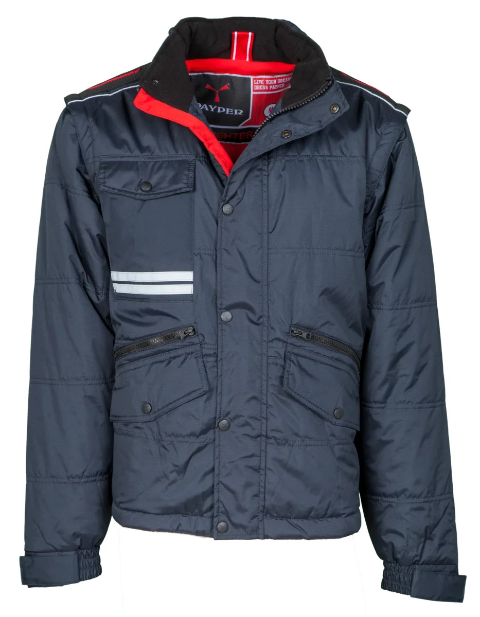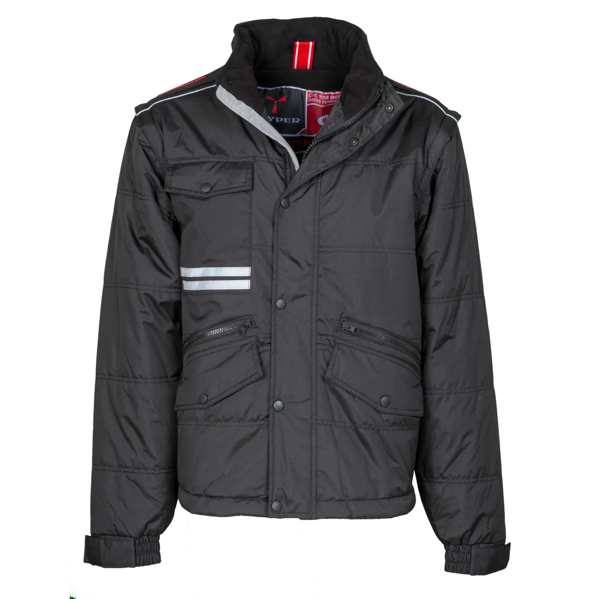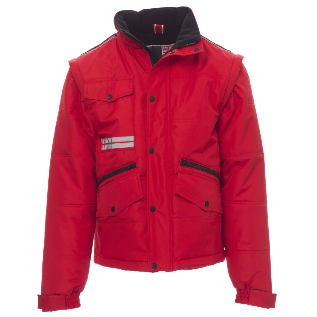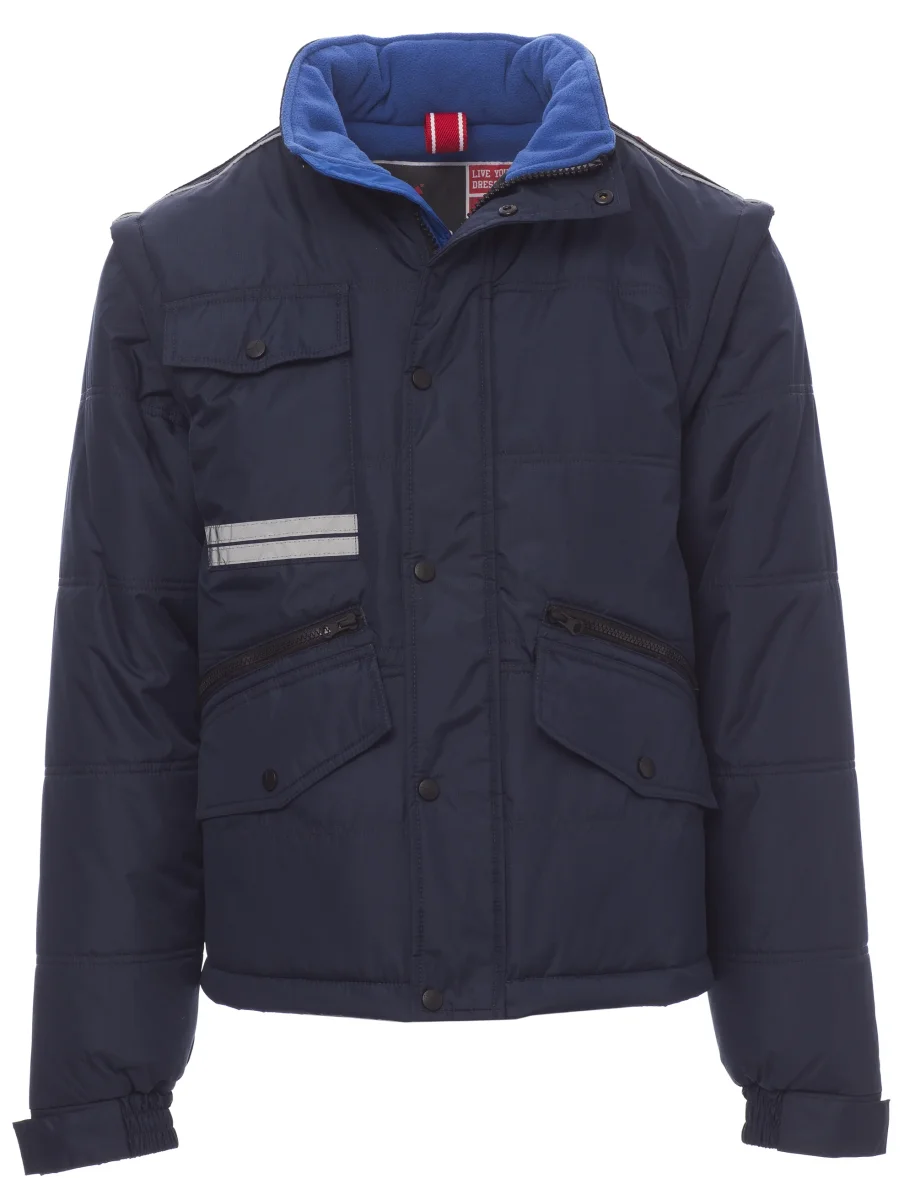 Blouson homme, manches détachables, zip en plastique de 8 mm avec curseur en métal, à rabat et boutons en plastique, dos profilé et capuche dissimulable dans le col, deux poches extérieures LOCK SYSTEM et deux poches zippées, poches obliques pour faciliter l’introduction des mains, une poche de poitrine pour smartphone et anneau porte-badge, bandes réfléchissantes sur la poche et dans le dos. Intérieur : rembourré, polaire en contraste sur le dos et le col.