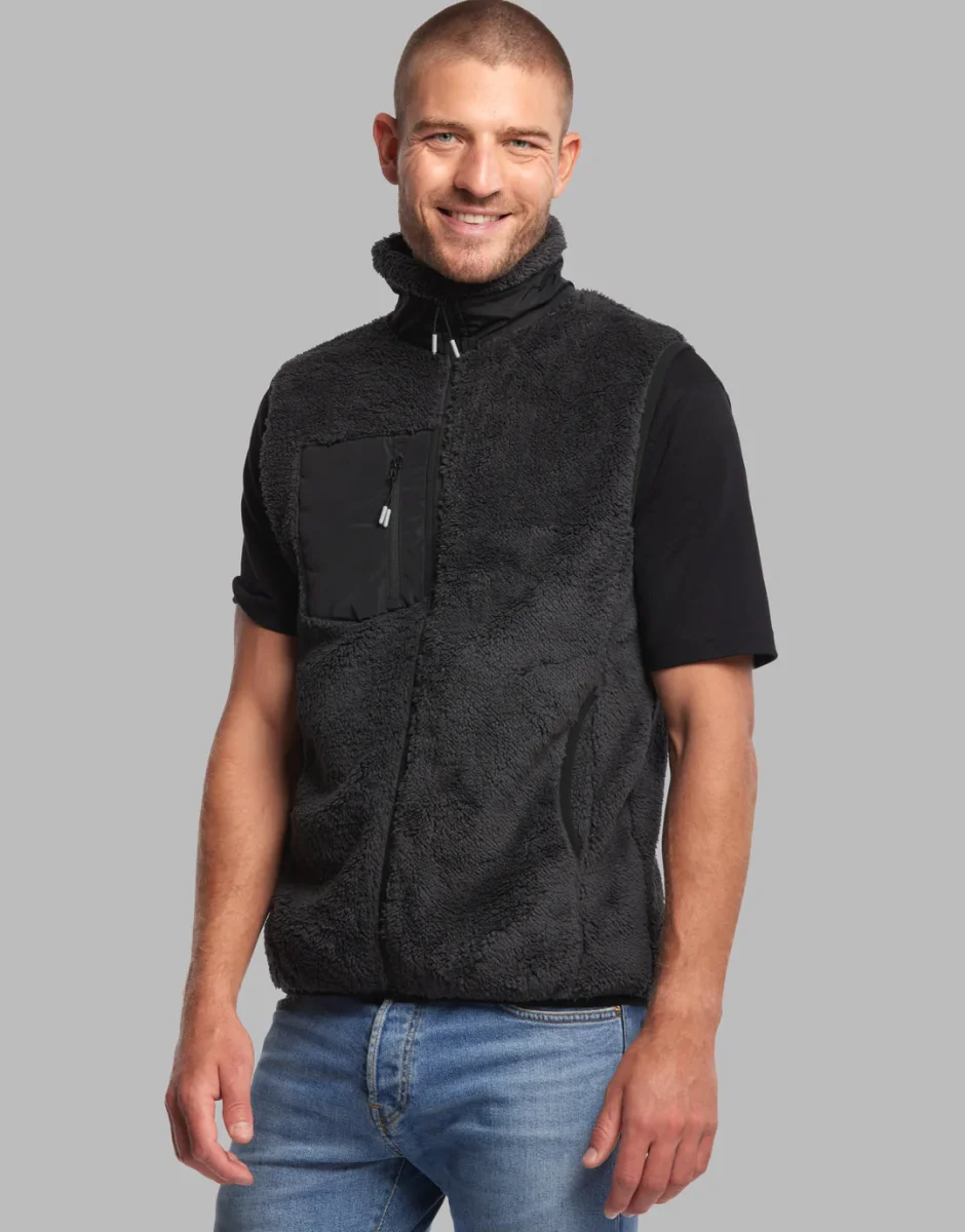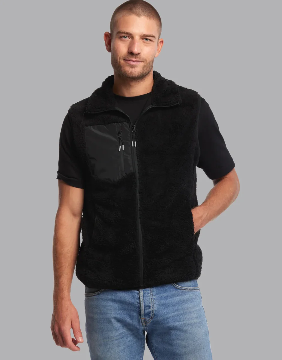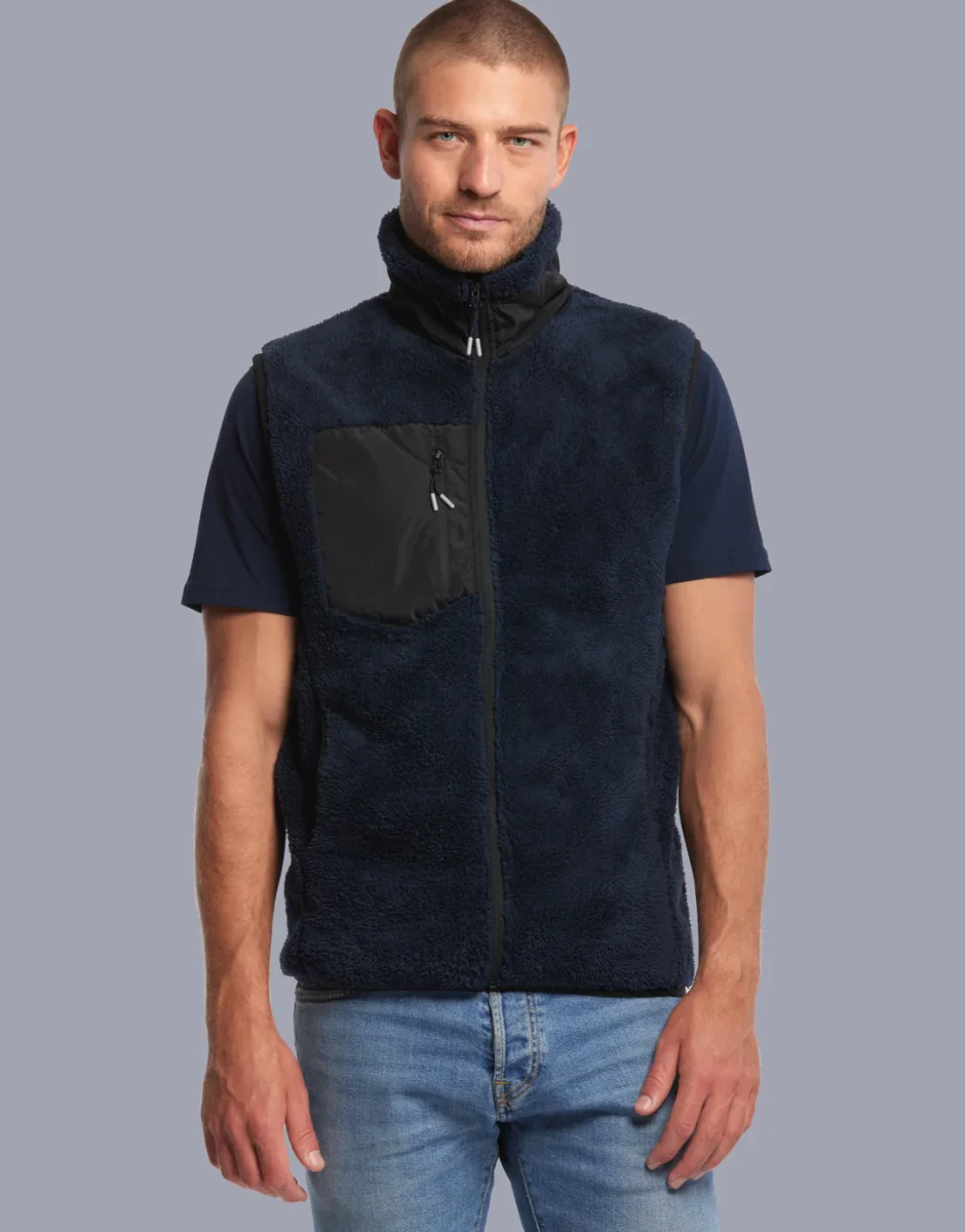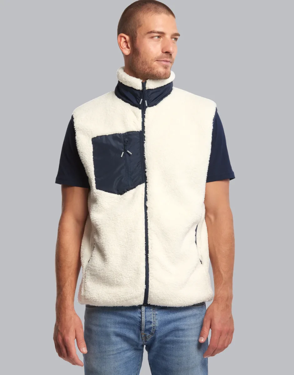 Gilet sans manches Homme en polaire brossée dite Sherpa. Matière 100% polyester dont 42% recyclé. Grammage de la Sherpa : 360g/m². Col montant. Empiècement côté anticoeur en polyester pour marquage. 2 poches mains zippées. Zip central en nylon. Intérieur en micropolaire non brossée.
