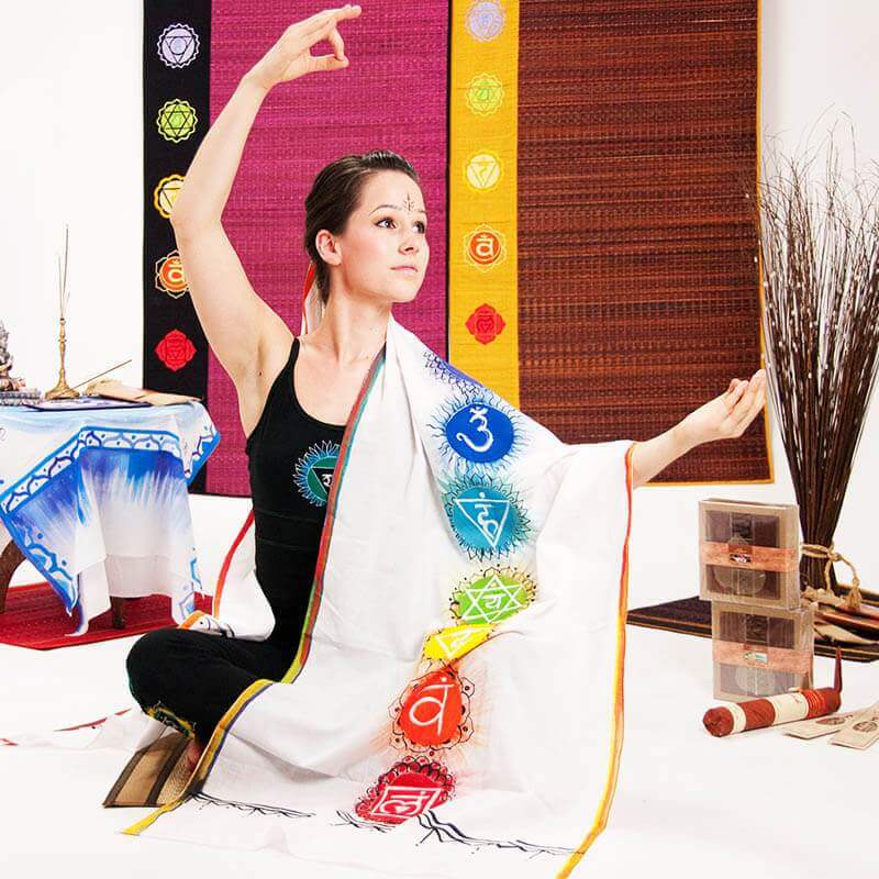 - Thème principal de cette étole de yoga : Sept chakras en Sanskrit dans leurs couleurs originelles