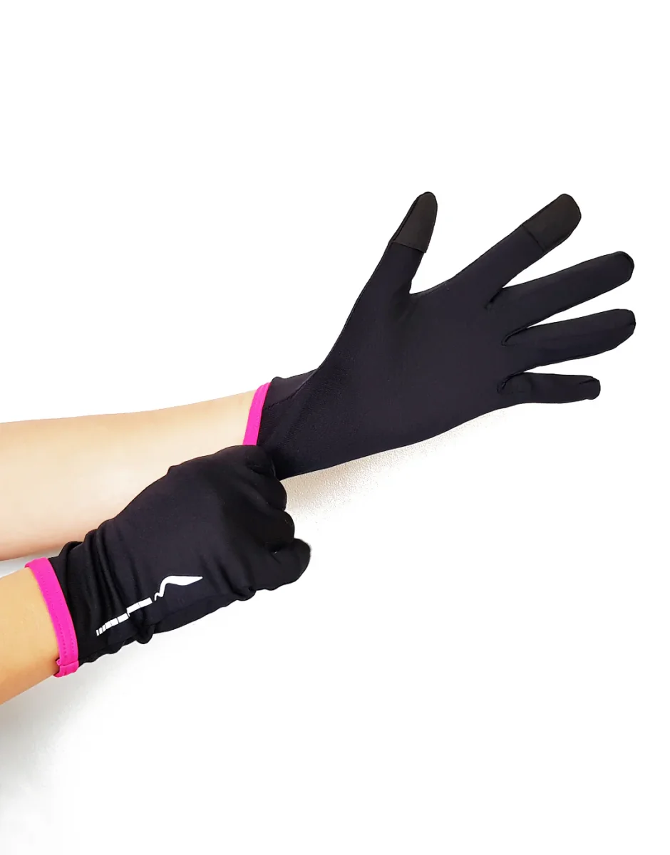 Gants féminins ajustés et élégants. Taillés pour la pratique du running en période fraiche. Ces gants noirs ont un biais fuchsia. Les pouces et index ont un revêtement Touch Screen utile pour le téléphone. Face interne brossée.