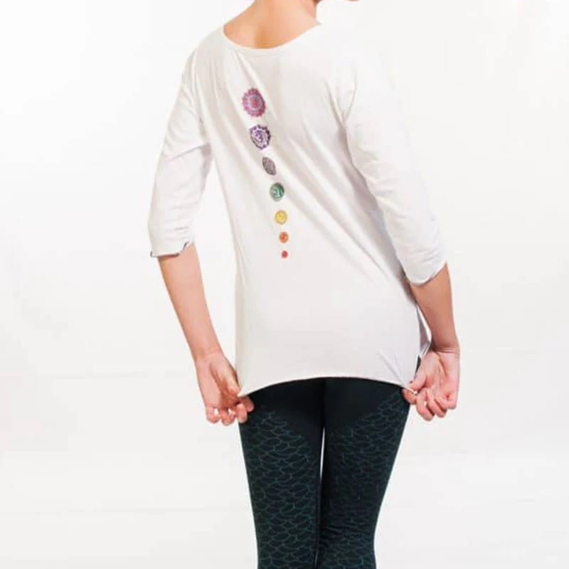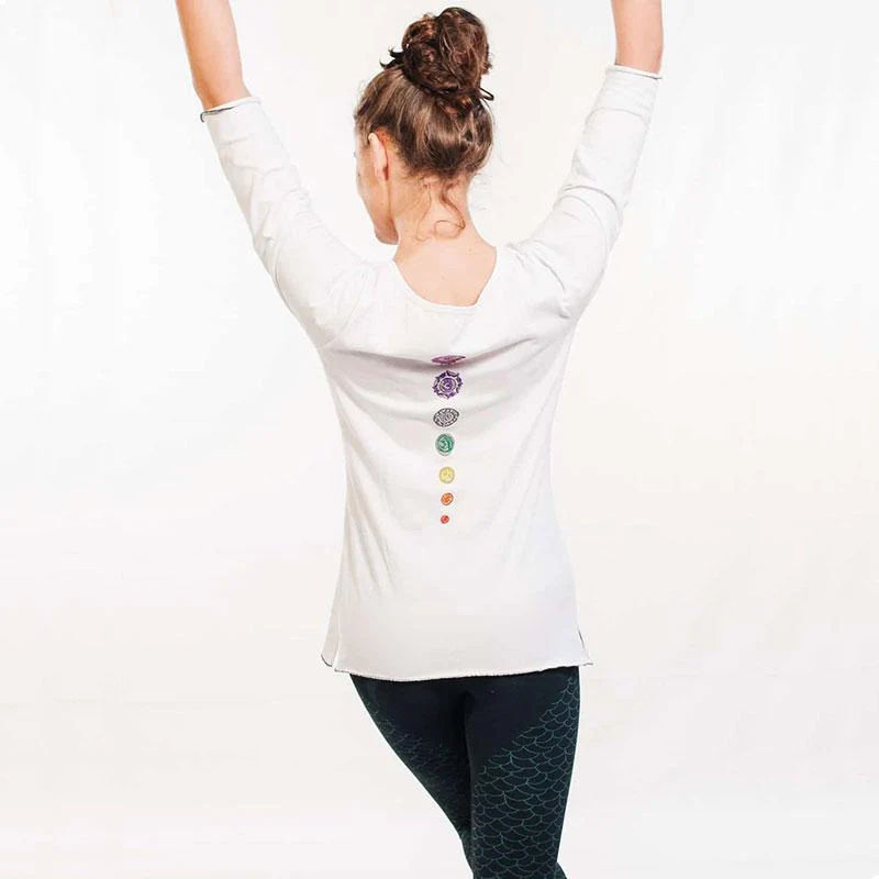 Yoga tee shirt designs sept chakras brodés 100% en coton biologique, qui a tous les atouts pour une pratique harmonieuse du kundalini yoga. Souplesse, douceur et respirabilité.