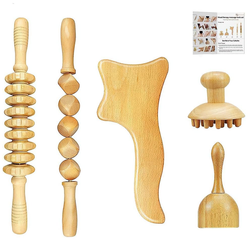 Détendez vous profondément avec le kit de massage en bois. Le rouleau à 9 roues pour une relaxation complète, le rouleau à 5 cubes pour une précision ciblée, la spatule en bois pour une détente spécifique, le masseur champignon pour éveiller les sens et la coupe de massage pour un soulagement musculaire profond.