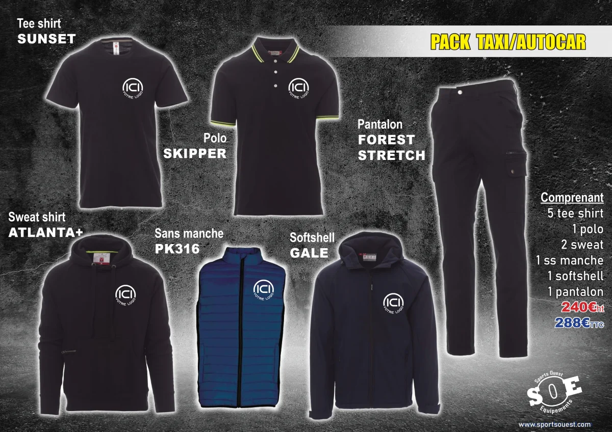 Ce pack Taxi / Car comprend : 5 tee shirts SUNSET logo coeur inclus, 1 polo SKIPPER logo coeur inclus, 2 sweats ATLANTA logo coeur inclus, 1 sans manche PK316 logo coeur inclus, 1 softshell GALE logo coeur inclus, 1 pantalon FOREST STRETCH. Taille : du XS au 5XL. Pantalon : du 38 au 68. […]