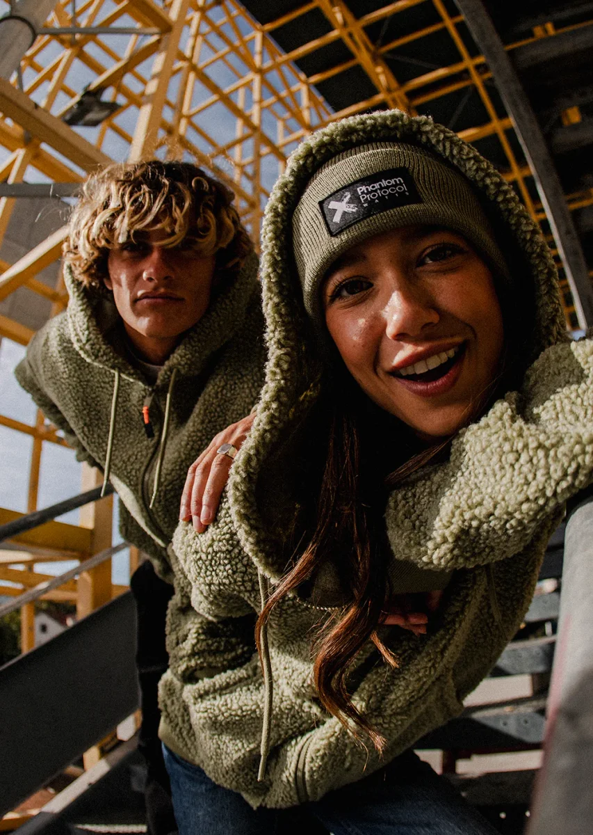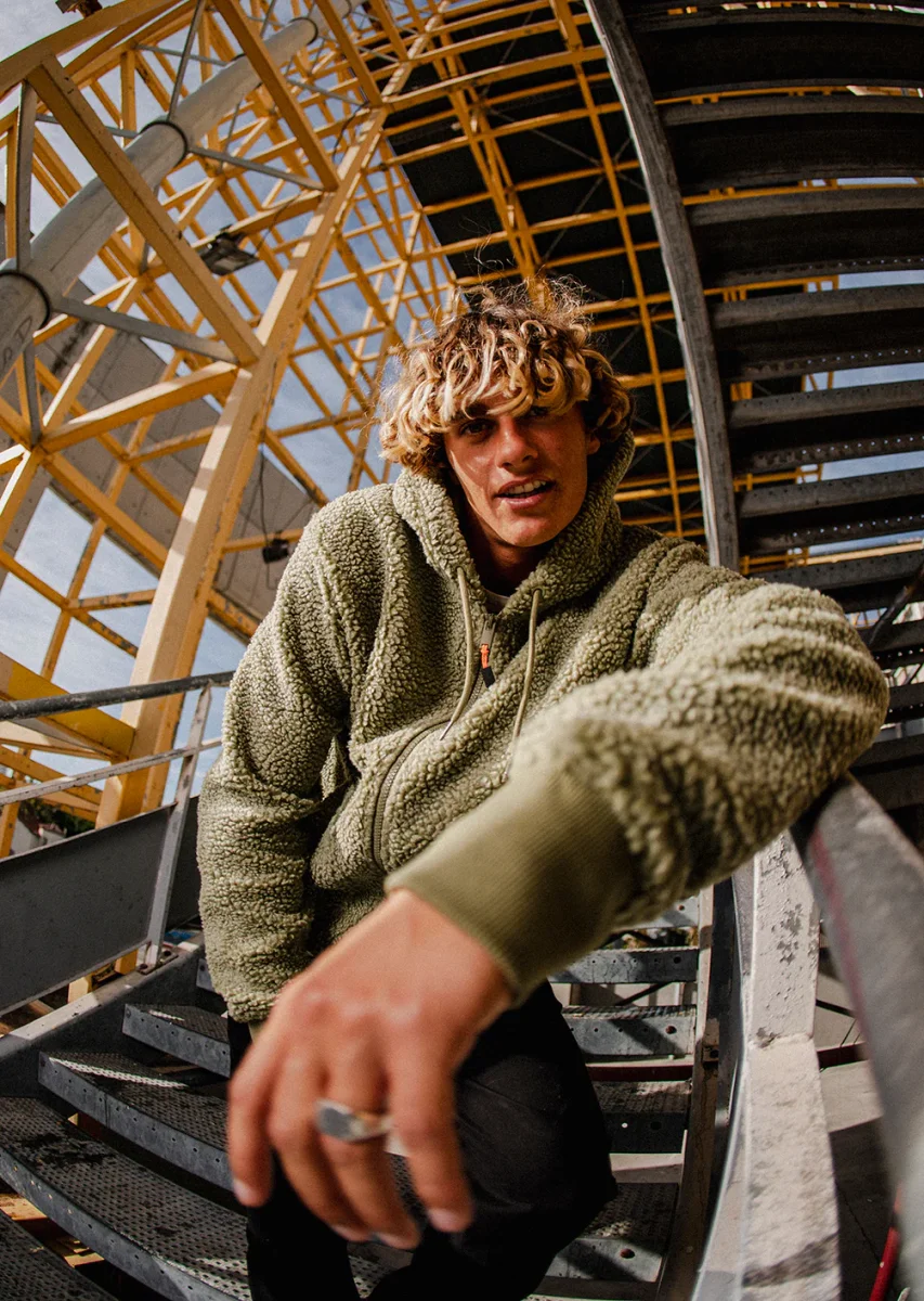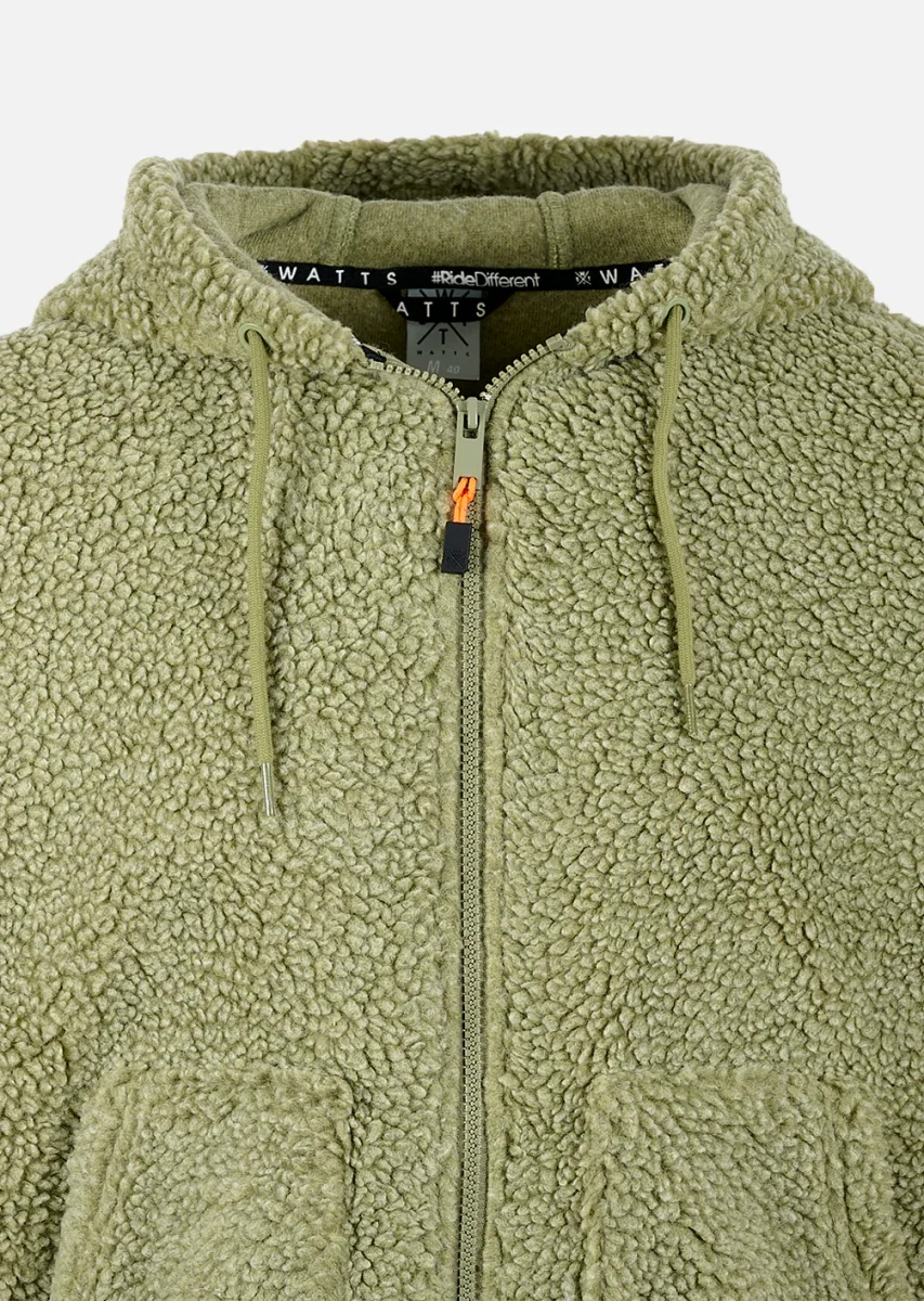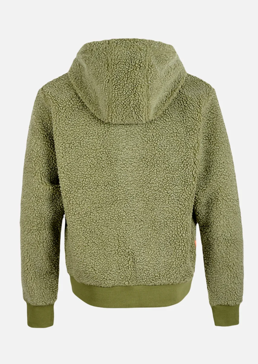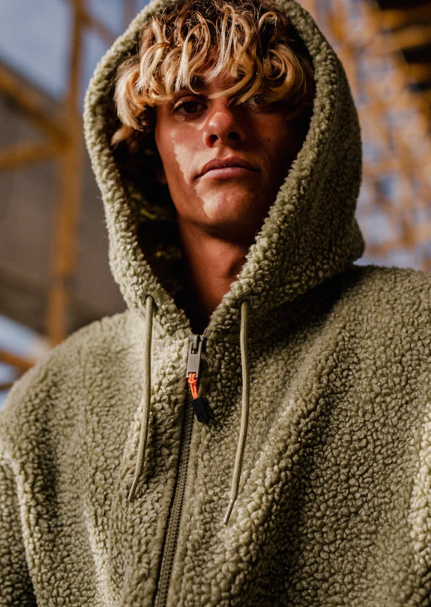 Confectionné en épais sherpa recyclé, il offre une chaleur enveloppante, respirante et douce, idéale pour l’hiver et la mi-saison. Ce tissu molletonné au rendu visuel riche procure un véritable effet cocon, tout en affirmant un engagement responsable envers l’environnement.