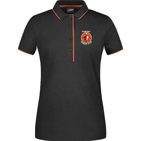 Polo disponible en modèle femme ou homme, noir et orange, logo club inclus.