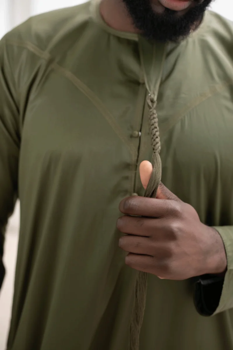 Confection à la main à Dubaï : Chaque Qamis Emirati kaki est confectionné à la main avec soin à Dubaï, garantissant une qualité supérieure et une attention aux détails.