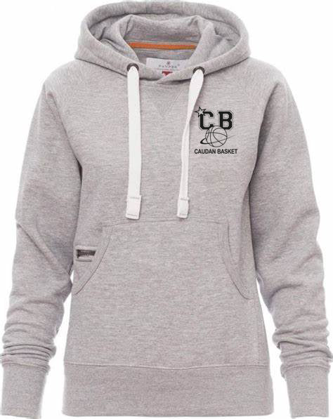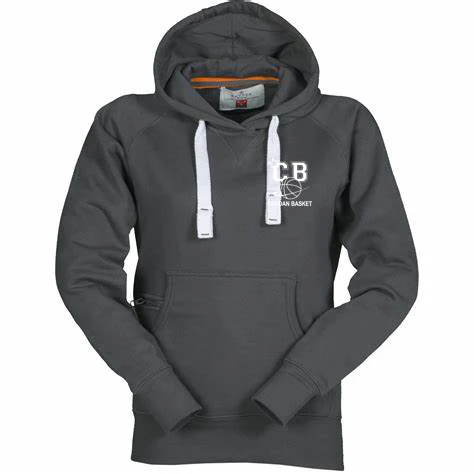 Sweat-shirt femme, coupe cintrée, avec capuche à deux coutures et coulisse en cordon blanc avec coutures teinte assortie et anneaux en métal . Manches raglan, couture esthétique en V au col, poches kangourou, petite poche à zip, poignets et taille en côtes élastiques, coutures renforcées. Gris chiné ou Noir. Logo club inclus. Composition : 70% […]