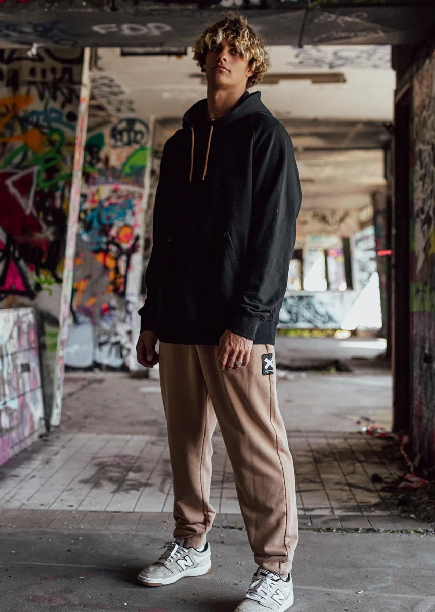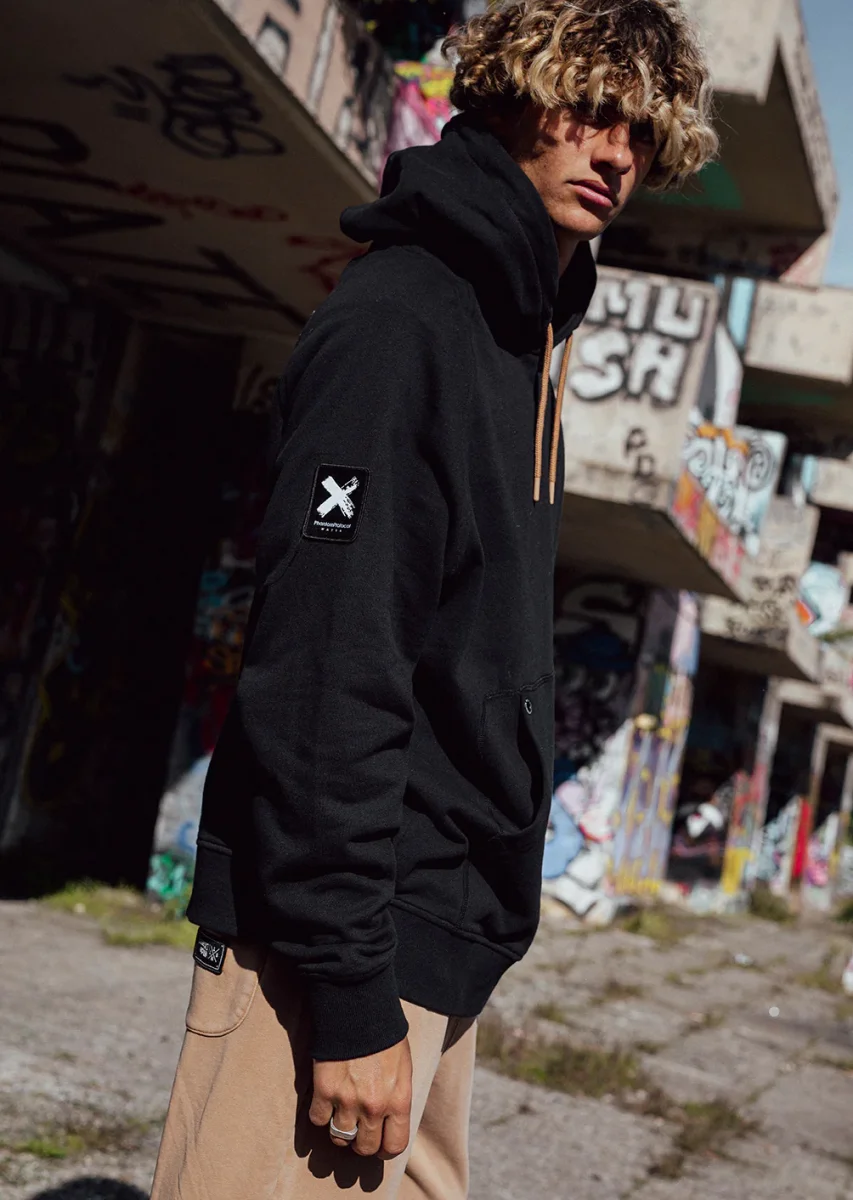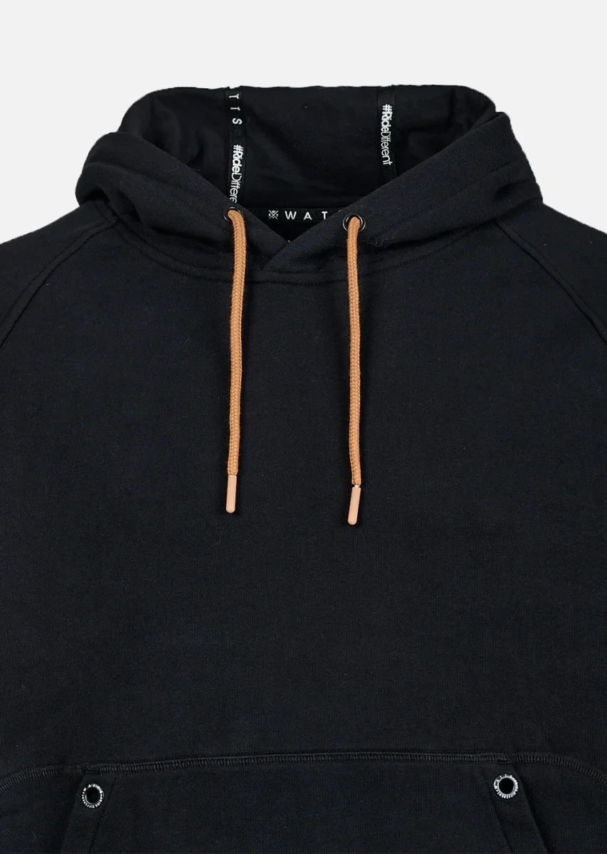 Sa teinte noire profonde est accentuée par des finitions soigneusement étudiées : cordon de serrage ton sur ton avec embouts métalliques, poche kangourou pratique avec détails de coutures, et patch discret signature Phantom Protocol cousu sur la hanche. Le tissu lavé lui apporte un effet légèrement usé, pour un look naturellement vintage et travaillé.