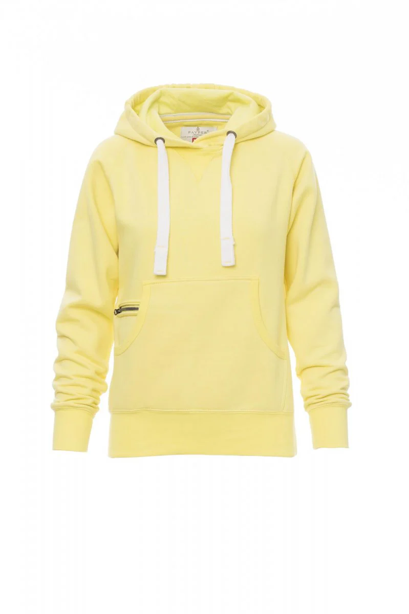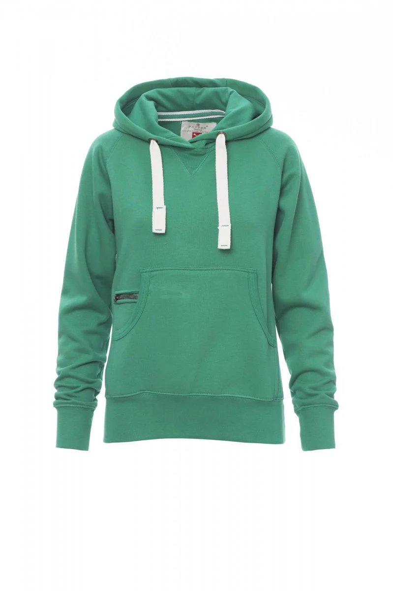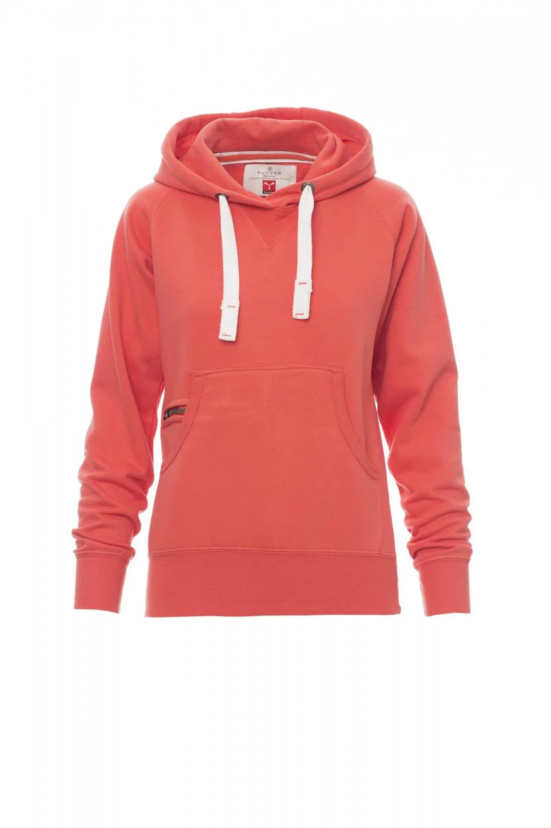 Sweat-shirt femme, coupe cintrée, avec capuche à deux coutures et coulisse en cordon blanc avec coutures teinte assortie et anneaux en métal . Manches raglan, couture esthétique en V au col, poches kangourou, petite poche à zip, poignets et taille en côtes élastiques, coutures renforcées.