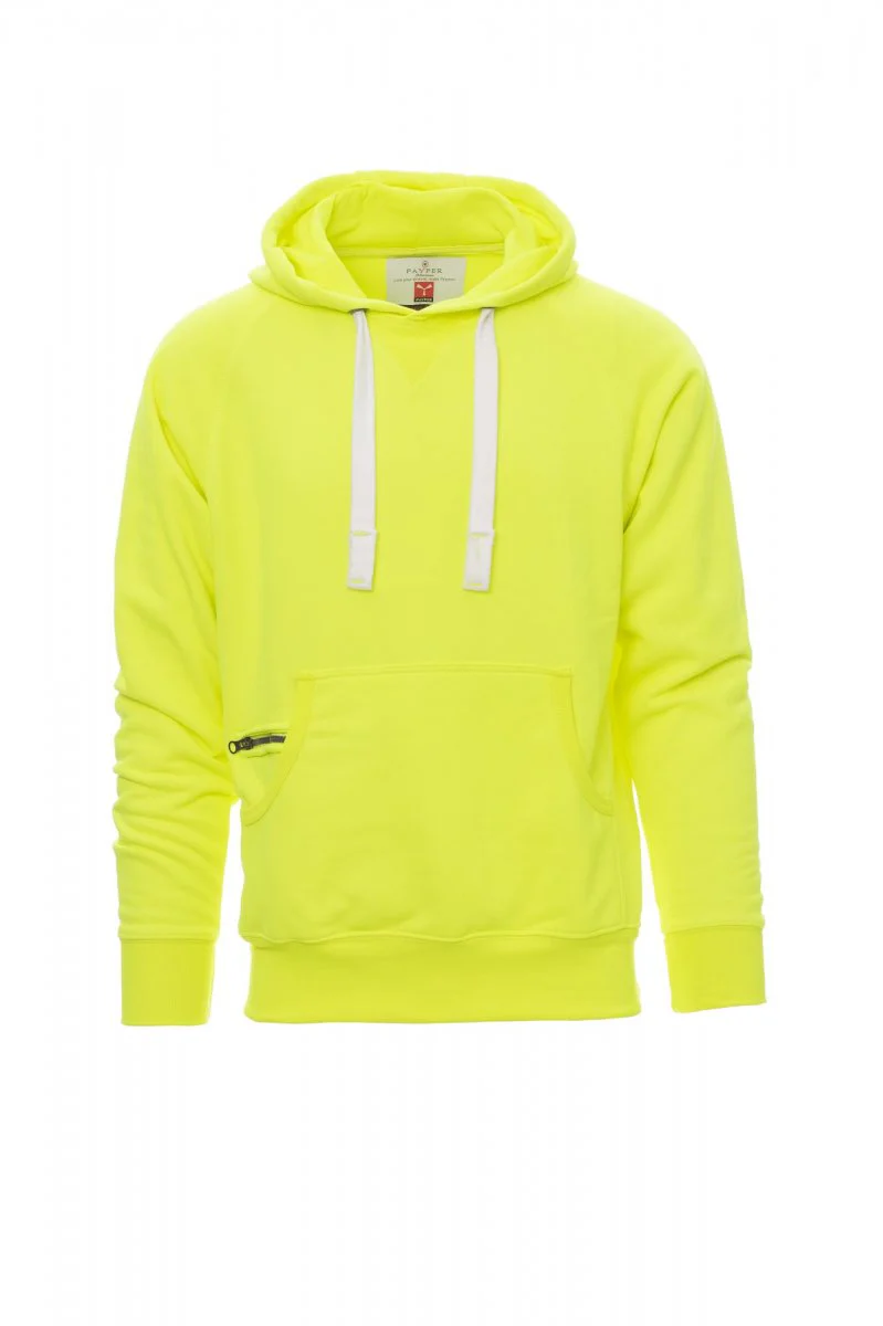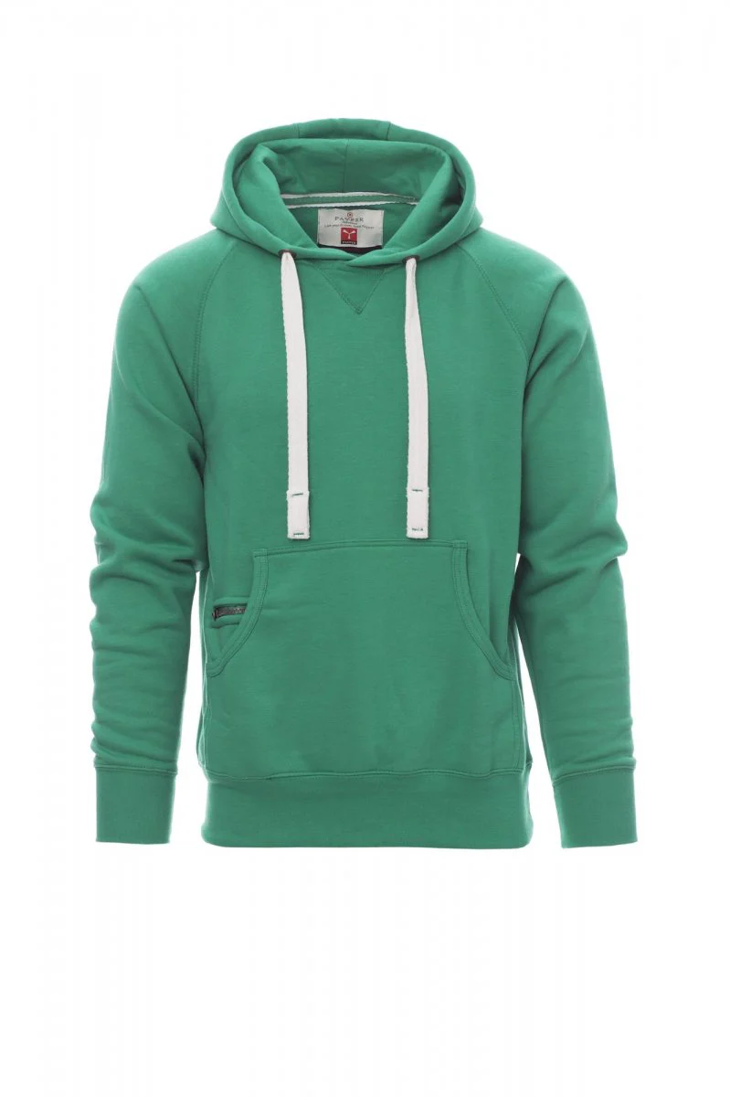 Sweat-shirt homme avec capuche à deux coutures et coulisse en cordon blanc à coutures teinte assortie et anneaux en métal . Manches raglan, couture esthétique en V au col, poches kangourou, petite poche zippée, poignets et taille en côtes élastiques, coutures renforcées. Composition 70% COTON + 30% POLYESTER Aspect BROSSE Poids 300 GR/MQ