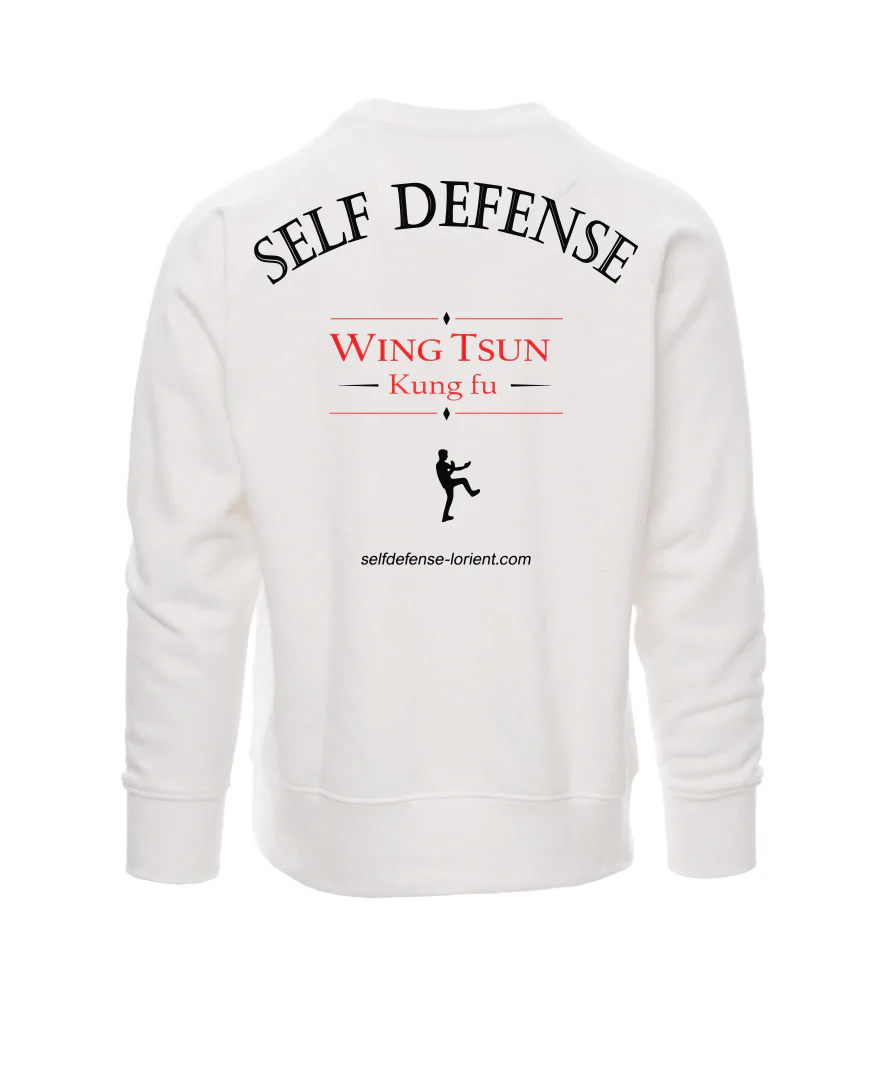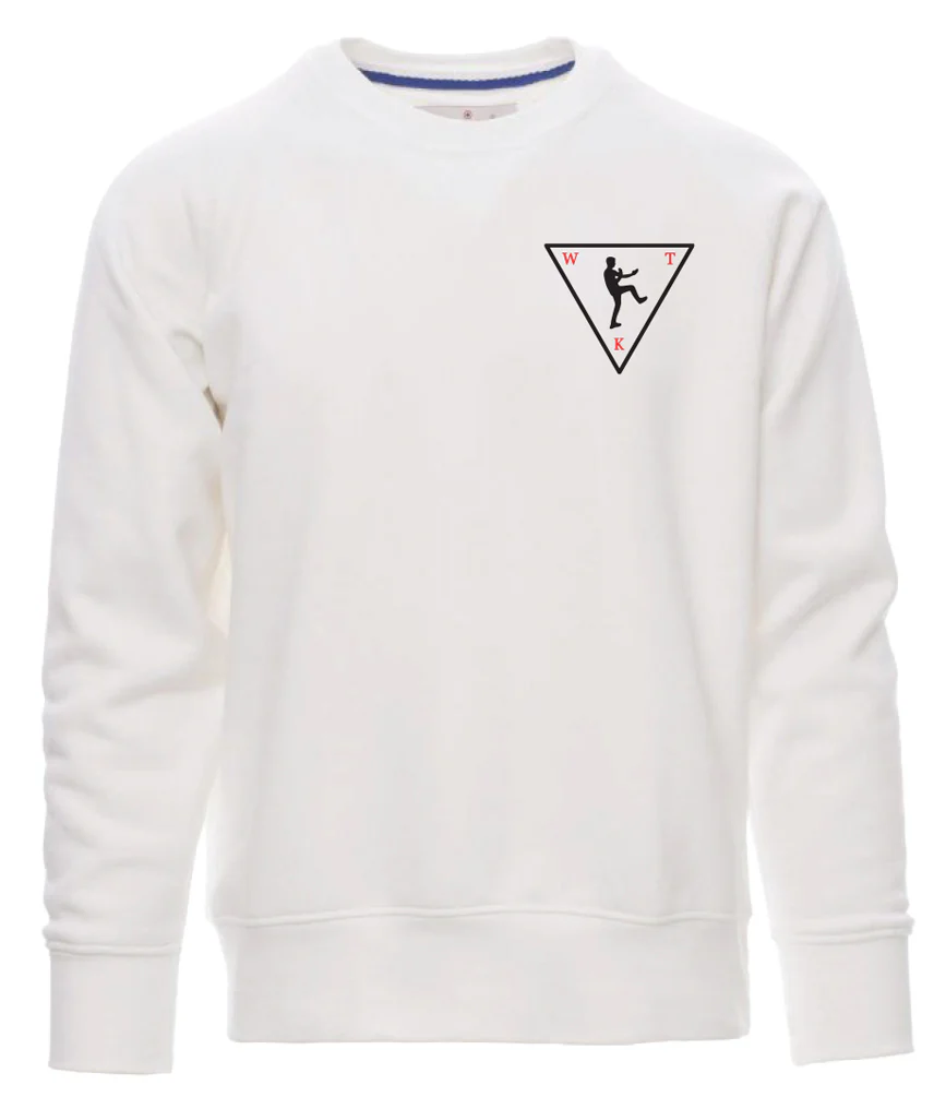 Sweat-shirt blanc , ras le cou, manches raglan, couture esthétique en V au col. Poignets et taille en côtes élastiques, coutures renforcées, logo coeur et dos inclus.