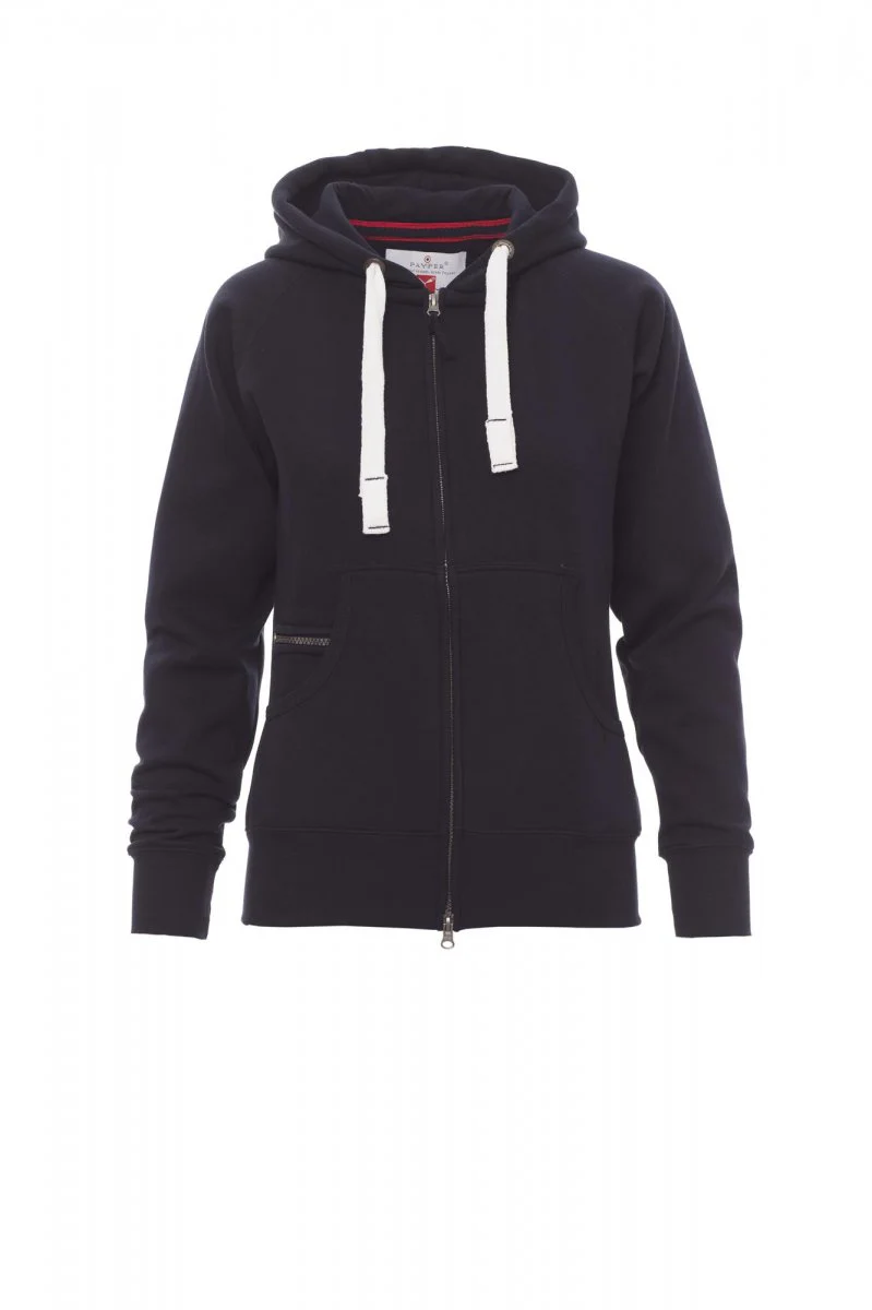 Sweat-shirt femme, coupe cintrée, full zip SBS couvert, en plastique et avec double curseur en métal . Capuche à deux coutures, coulisse en cordon blanc à coutures teinte assortie et anneaux en métal . Manches raglan, poches kangourou avec petite poche zippée, poignets et taille en côtes élastiques. Coutures renforcées.