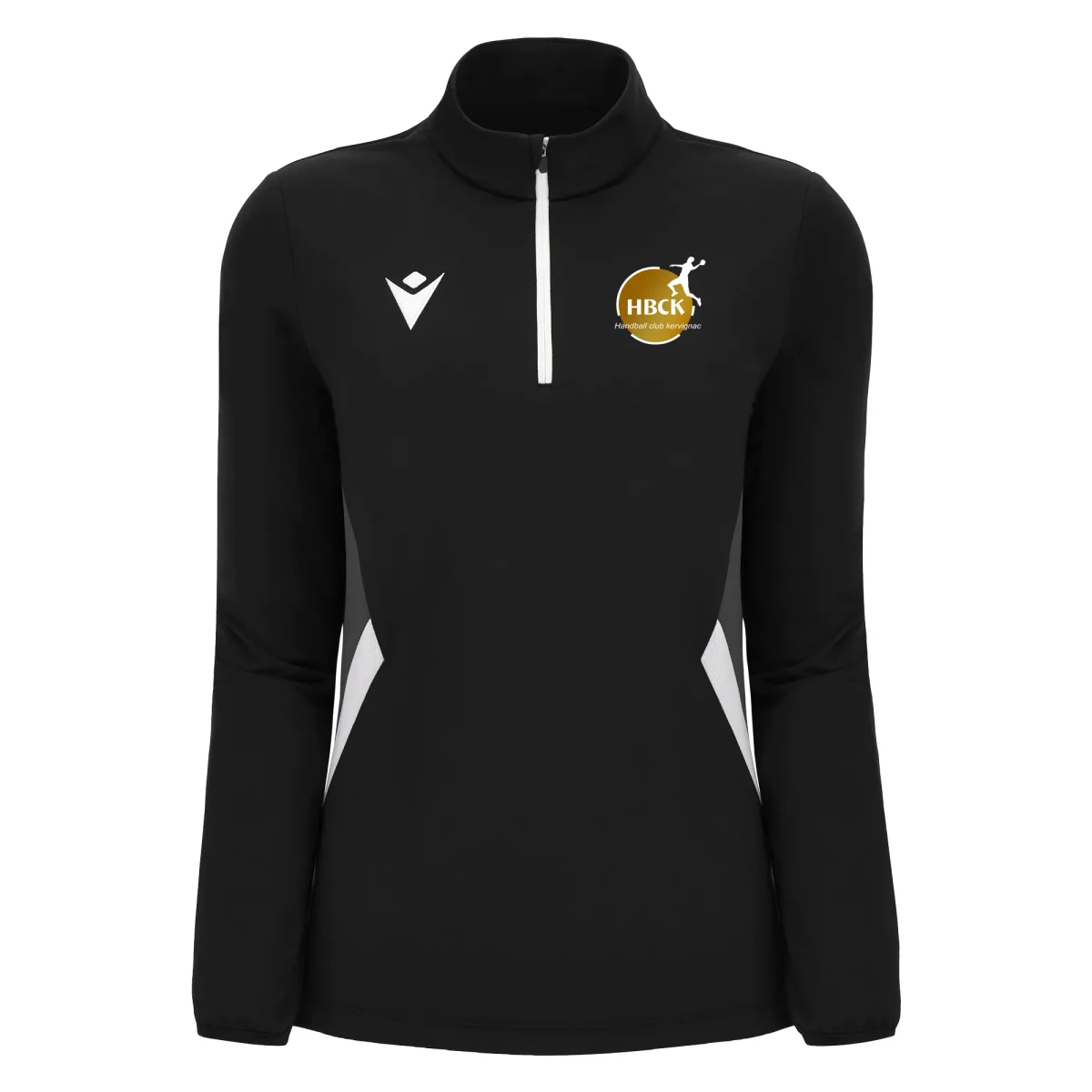 Sweat femme 1/4 zip MAIRA Macron, noir, logo club inclus.
