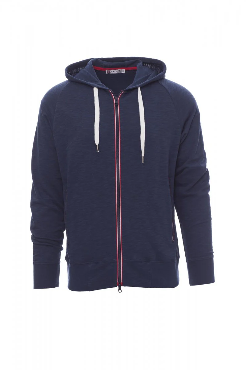Sweat-shirt pour homme à zip intégral en nylon contrasté, manches raglan, capuche et cordon coulissé de couleur en contraste, ruban intérieur col en contraste, poignets et taille en bord côtes élastique et deux poches avec zip sur le devant. Composition 80% COTON + 20% POLYESTER Aspect FRENCH TERRY EFFET FLAMME Poids 250 GR/MQ