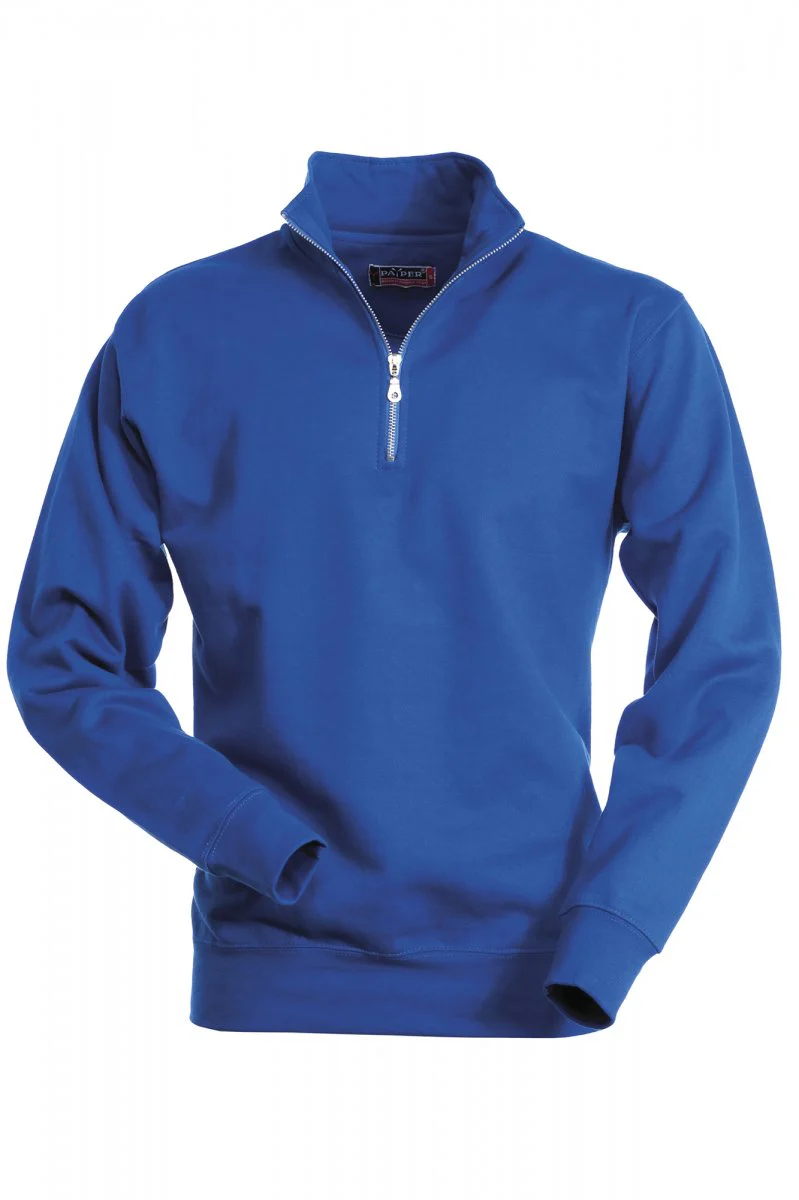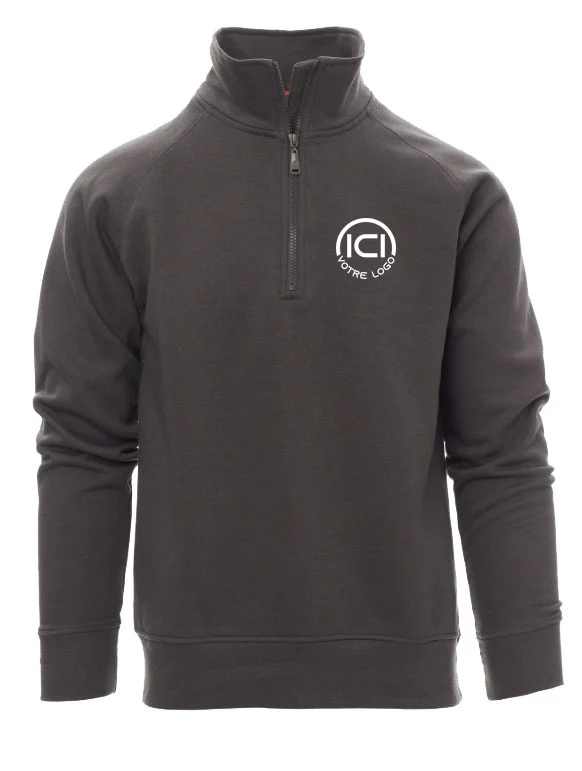 Sweat-shirt à demi Zip de métal, poignets et taille en bord côte élastique, double couture au col, aux manches et sur la taille et ruban de renfort au col. Composition 85% COTON + 15% POLYESTER Aspect BROSSÉ Poids 290 GR/MQ Taille : du XS au 5XL