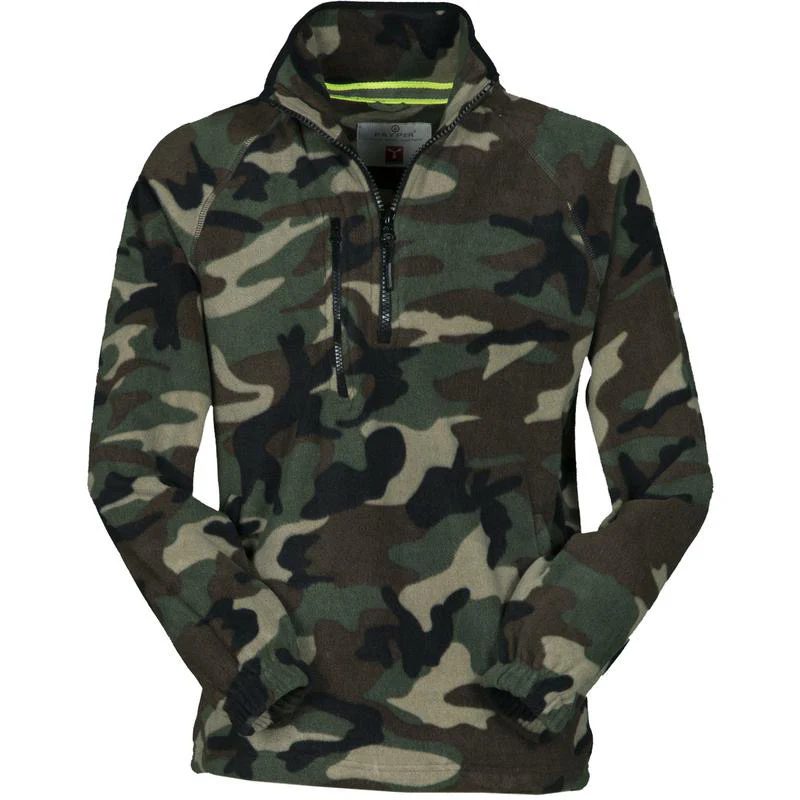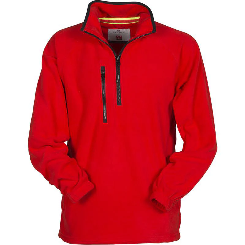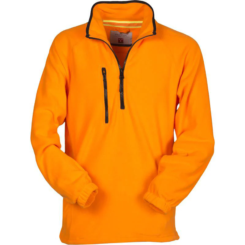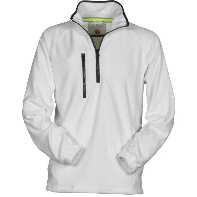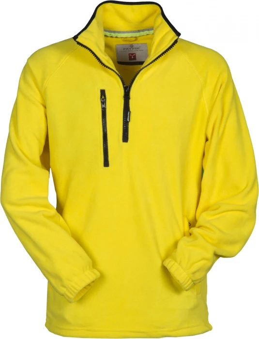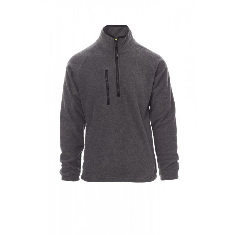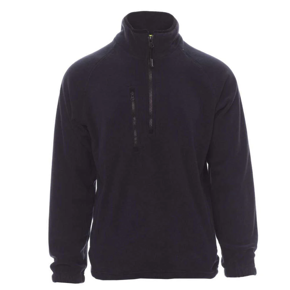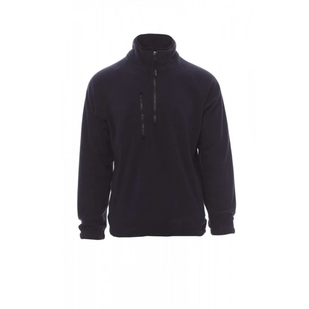 Veste polaire à demi-zip en plastique noir, manches raglan, coulisse réglable à la taille, élastiques serre-poignet, deux poches avec zips couverts, une poche avec zip sur le devant, col avec bordure de renfort en contraste, coutures renforcées. 100% polyester polaire
