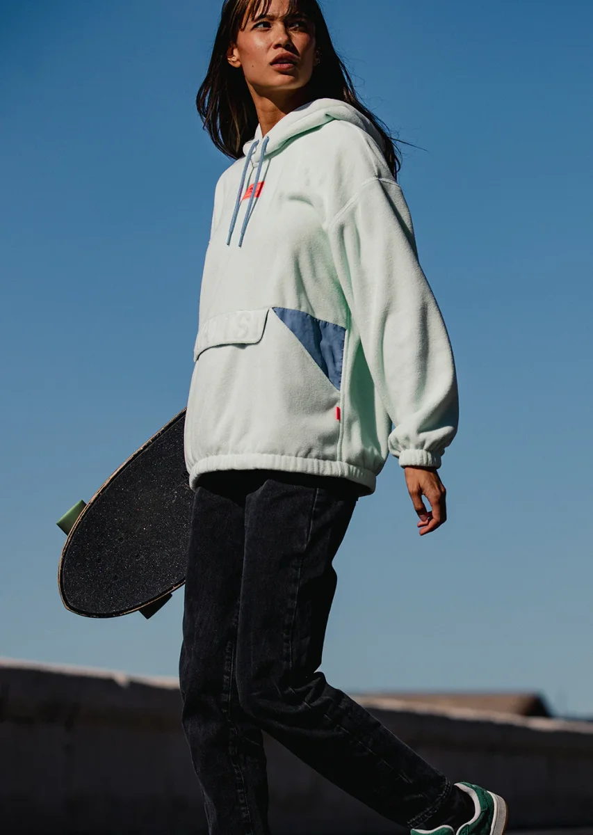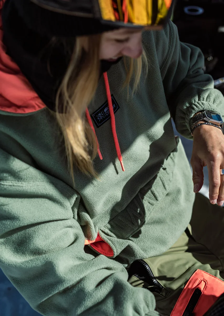 Le hoodie UPSIDE Vert Clair modernise la polaire d’inspiration alpine avec une approche graphique et fonctionnelle. Son coloris pastel lumineux contraste élégamment avec les empiècements sombres et le col montant fermé par une patte tissée signature. Le look est à la fois doux et affirmé, parfait pour les exploratrices urbaines et sportives.