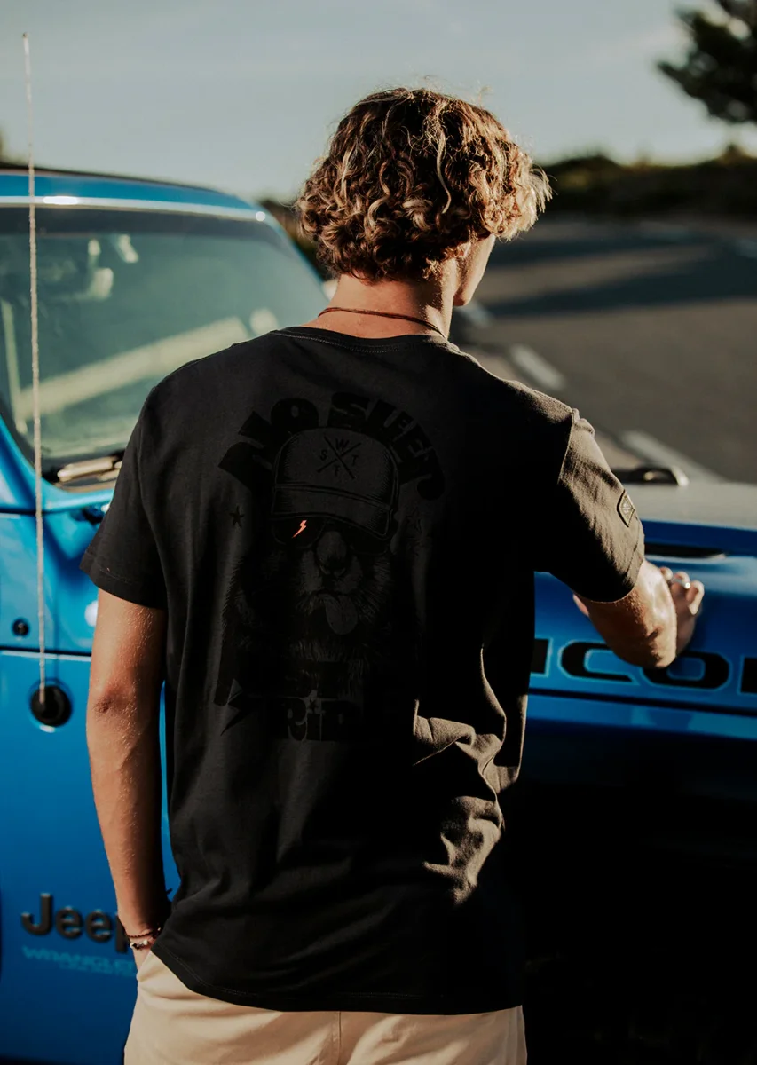 Le tee-shirt Overmint Gris Anthracite combine sobriété et impact visuel. Sa teinte sombre met en valeur le graphisme contrasté au dos : un personnage décalé avec casque, lunettes et le slogan emblématique « No Sleep Just Ride ». Confectionné en coton biologique et doté d’une coupe regular, il offre un confort durable tout en affirmant une identité forte. Idéal pour ceux qui veulent un look stylé, efficace et sans artifices.