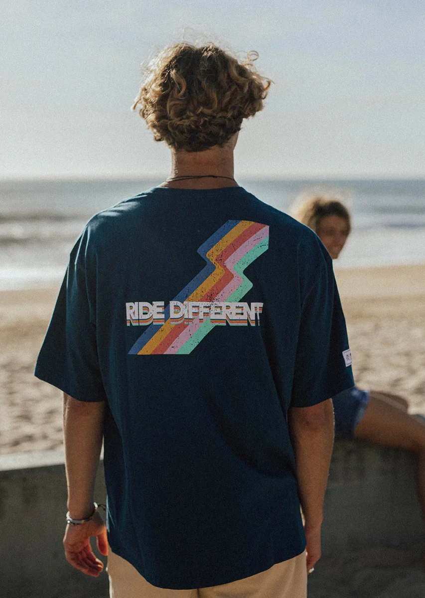 Le T-shirt Thunder Bleu parle de lui même, « Ride Different » est l’essence même du style décontracté et dynamique, conçu pour les passionnés de skate et de surf. Sa coupe oversized vous offre une grande liberté de mouvement, idéale pour vos sessions sur la planche. À l’arrière, un imprimé éclatant en forme d’éclair, avec un jeu de couleurs arc-en-ciel pour les amoureux d’aventure qui repoussent leurs limitent. À l’avant, un petit rappel du design côté cœur, apportant une touche subtile mais significative. Fabriqué en coton organique, ce T-shirt allie confort, respect de l’environnement et durabilité, pour un look à la fois tendance et éthique.