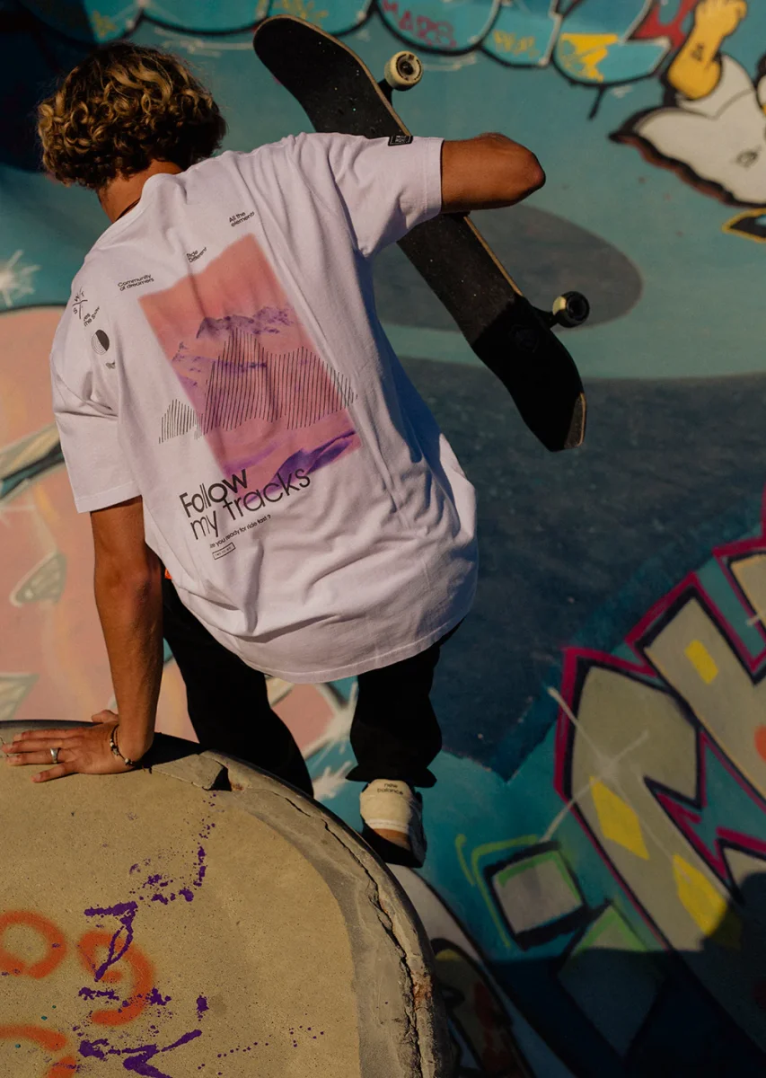 Le t-shirt Tracks Blanc affiche un visuel saisissant en contraste total : une photo de montagne teintée de rose fluo accompagnée du message « Follow my tracks ». Pensé pour les esprits libres, il allie simplicité et impact graphique.