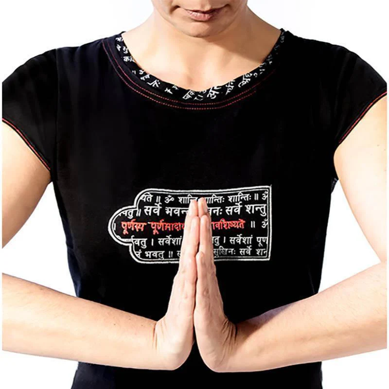 Le Maha Mrityunjaya mantra en Sanskrit résonnant dans un coton biologique premium est l’offrande que vous fait ce t shirt yoga femme.