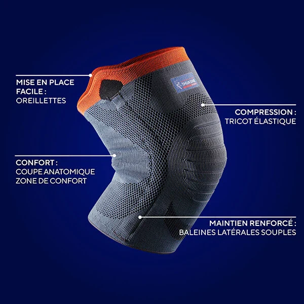 - Zones de confort au niveau de la rotule et de l’arrière du genou (creux poplité) grâce à un tricotage dédié