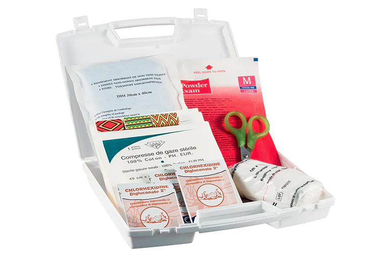 Valise de secours TAXIAvec poignée de transportPolypropylène blancDimensions : 240 x 205 x 48 mmPoids : 433 gValise livrée emballée
