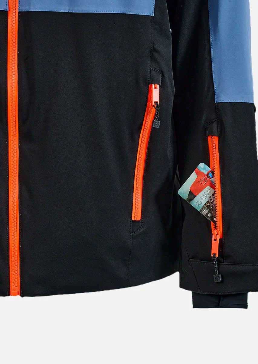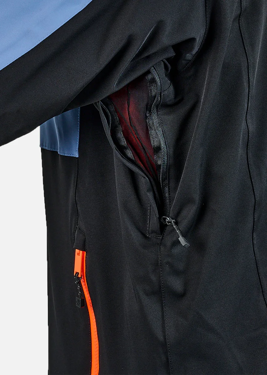 Avec ses contrastes visuels bleu gris et noir charbon -le tout réhaussé par un orange vif – la veste s’impose aussi comme une pièce forte, stylée sans excès, au design structuré et intemporel.