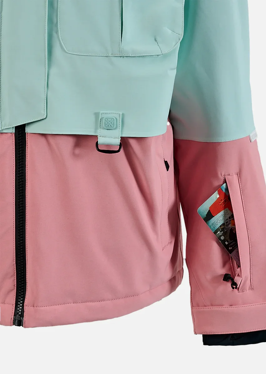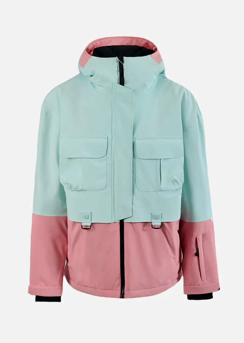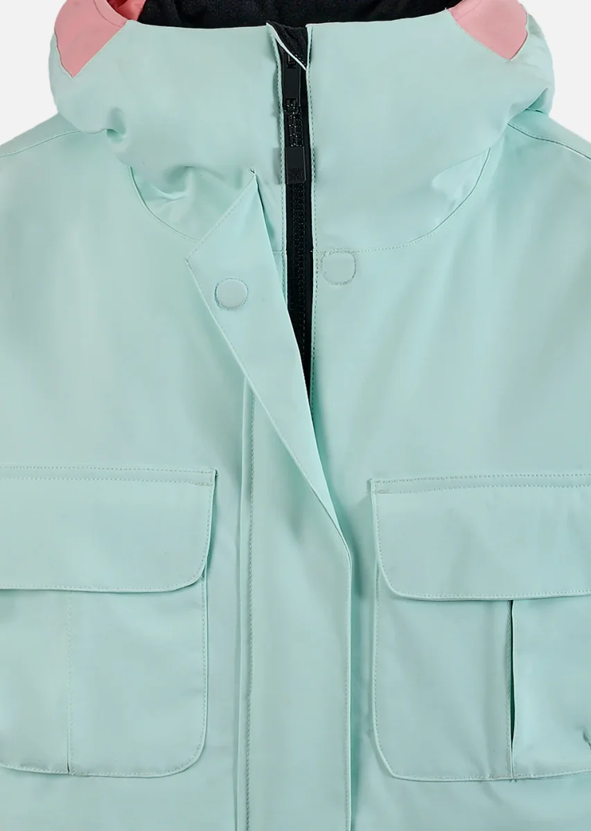 Le design est marqué par des pochettes cargo pratiques sur la poitrine, des détails techniques invisibles mais efficaces : capuche réglable, zips étanches, pare-neige, poignets ergonomiques… Tout est pensé pour la performance et le confort au quotidien.