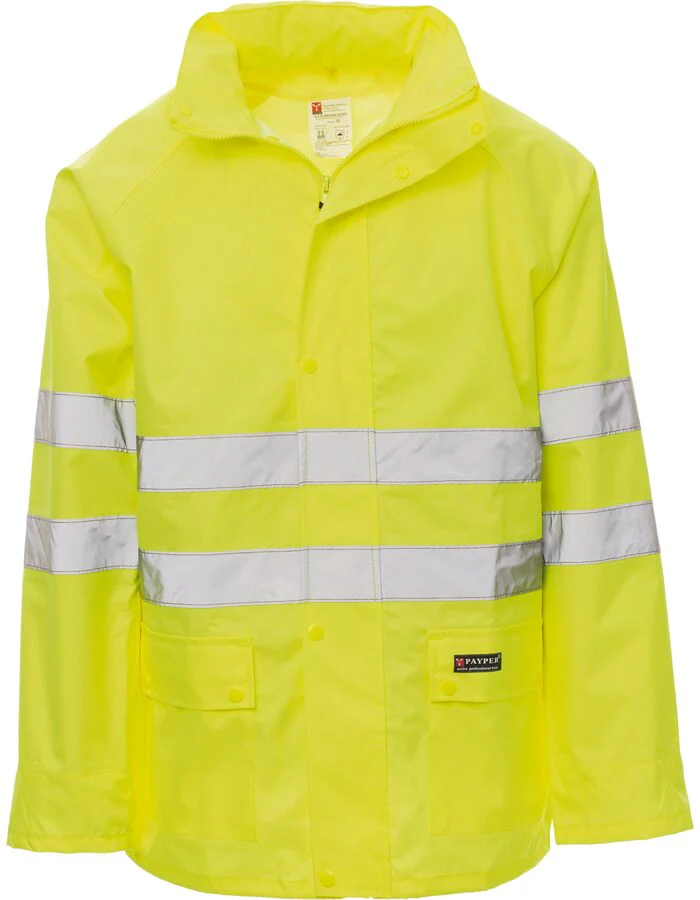 Veste anti-pluie à haute visibilité avec bandes 3M, manches raglan, zip intégral en nylon et patte à boutons-pression, capuche pliable dans le col, coulisse à la taille, bas des manches droit avec poignet élastique intérieur, deux poches enveloppe avec rabat . Bandes et coutures thermosoudées.