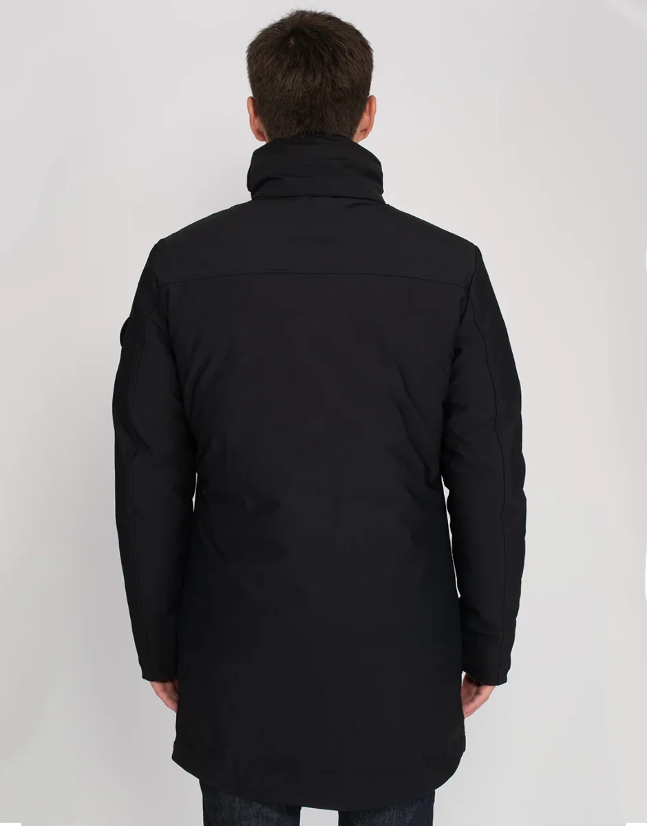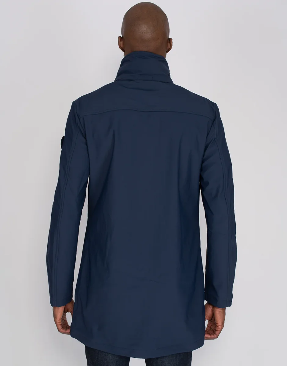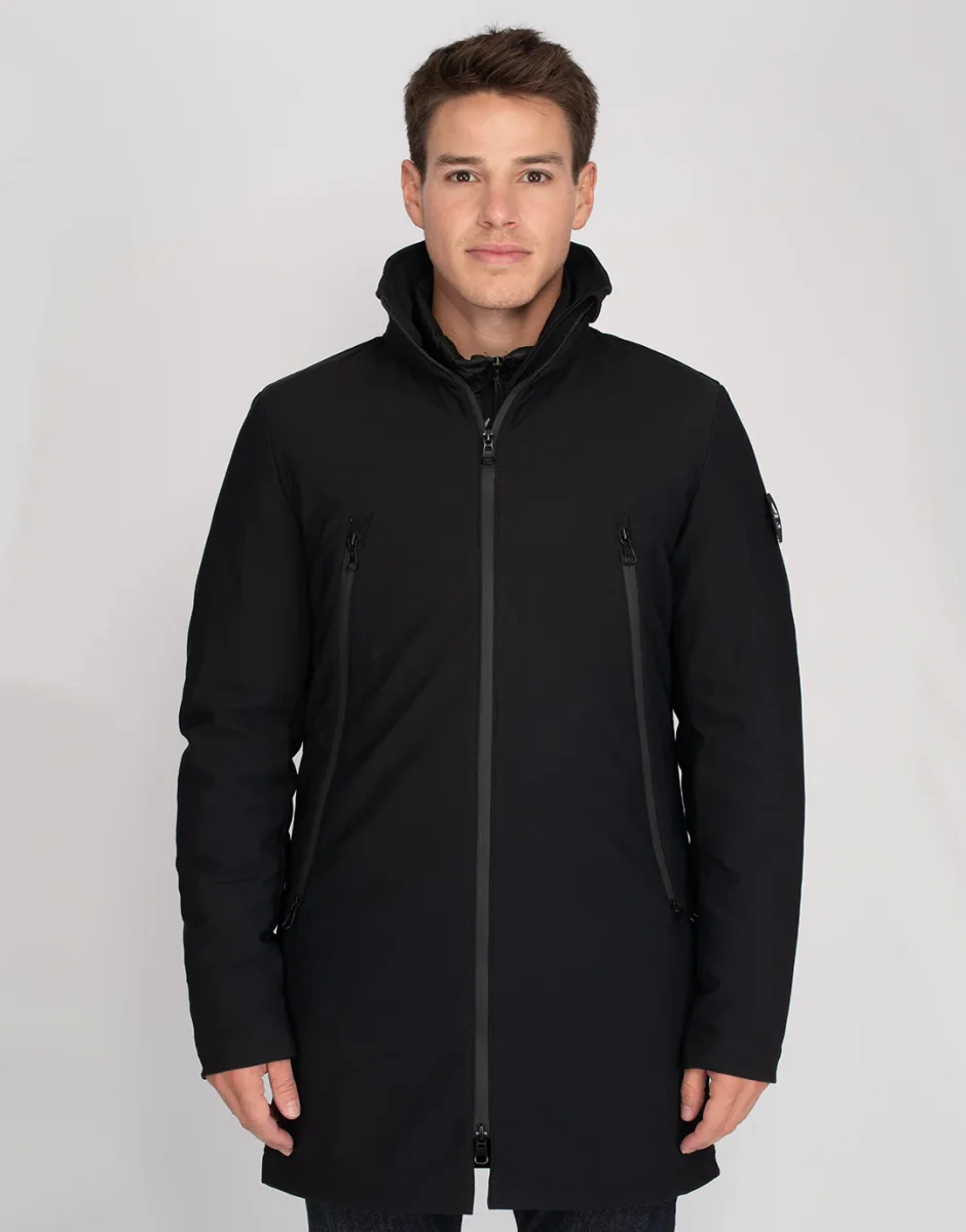 Veste longue unisexe en softshell 2,5 couches. Extérieur 90% nylon 10% elasthanne. Veste 100% imperméable grâce à sa membrane en TPU. Deux grandes doubles poches sur les côtés fermées par un zip waterproof avec puller design. Zip central waterproof. Capuche sous col. Taille ajustée.