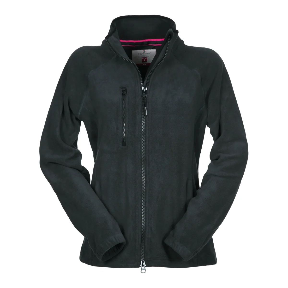 Veste polaire cintrée pour femme à zip de 8 mm en plastique noir, manches raglan, coulisse réglable à la taille, élastiques serre-poignet, deux poches avec zips couverts, une poche avec zip sur le devant, col avec bordure de renfort en contraste, coutures renforcées.