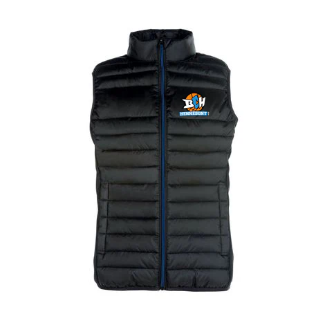 Veste sans manche, noir/royal, logo club inclus. Bodywarmer léger moderne bi-matière. 2 poches latérales zippées. Protège-menton. Zips contrastés. Grammage : 210 g/m² Tailles : du S au XXXL Femme ou Homme Option marquages : rendez-vous sur Marquage – Sports Ouest Equipements